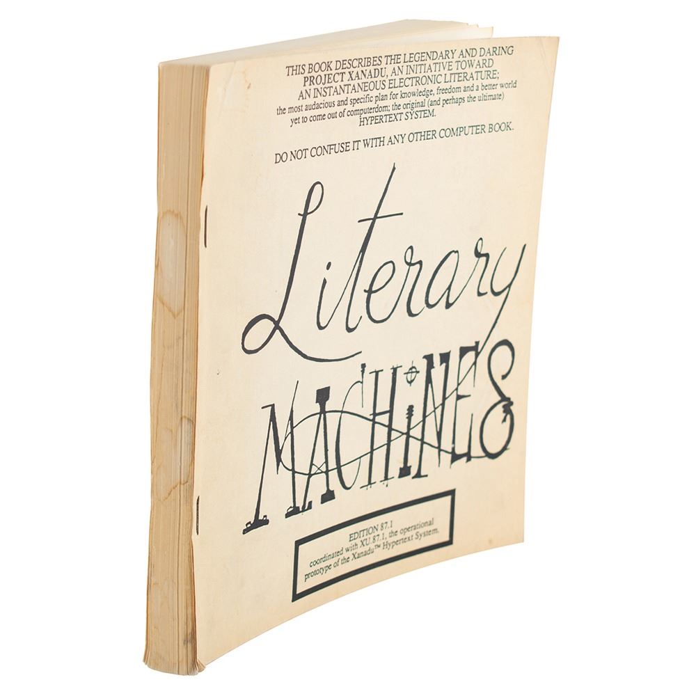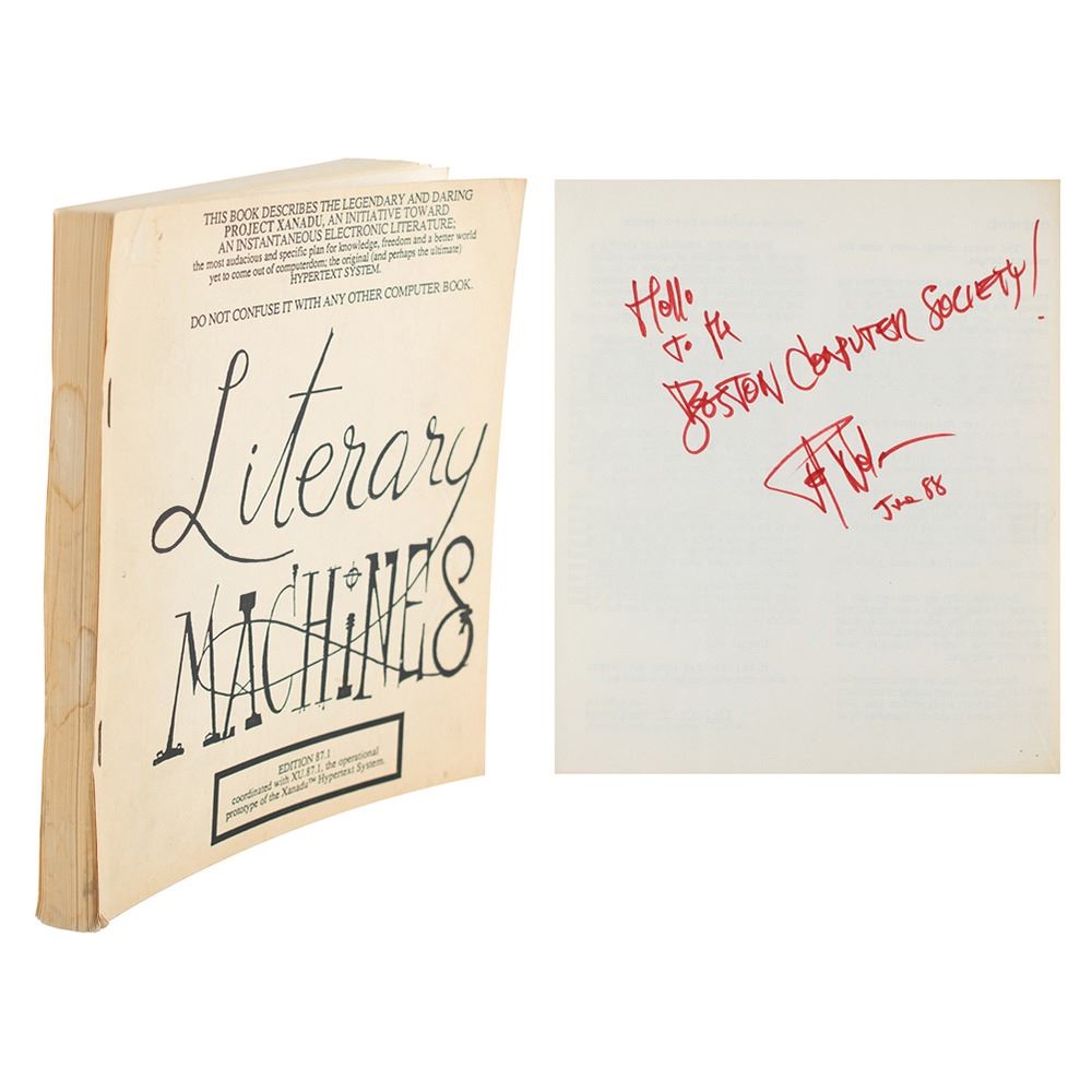 Scarce signed book: Literary Machines, Edition 87.1. Self-published, 1987. Staple-bound softcover, 7.75 x 8.5, 263 pages. Signed and inscribed on the first free end page in red felt tip, "Hello to the Boston Computer Society! Ted Nelson, June 88." In fine condition, with toning and light staining to the covers and spine edges. The consignor notes he obtained the signature in person as a leader of the Hypermedia Group at the Boston Computer Society in 1988. Literary Machines is Nelson's fleshed-out concept for a networked hypertext system. An actual software implementation was later attempted by Autodesk in the late 1980s and early 1990s, before the later and partly-competing concept of the World Wide Web gained traction. This Edition 87.1 is mid-timeframe, self-published; the editions spanned 1982-1993, with the last produced by Mindful Press/Eastgate Systems.