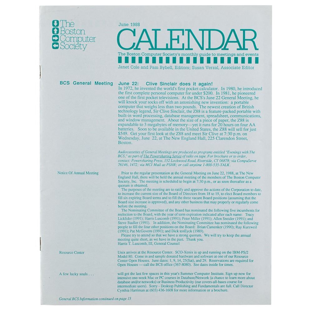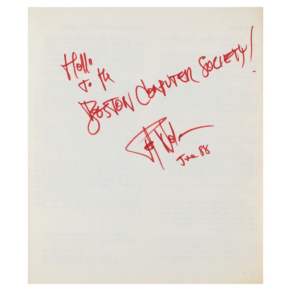 Accompanied by a letter of authenticity from the consignor, and by a contemporary calendar newsletter for the Boston Computer Society identifying the consignor's role. The letter notes: "I had a conversation with Mr. Nelson, telling him that I and others were helping promote hypertext use through several Boston Computer Society user groups specializing in hypermedia, Apple Macintosh, CD-ROMs, and other topics. I bought the book on my own initiative and with my funds, and had intended to circulate it among local BCS members, and hence I requested the greeting that Mr. Nelson wrote above his signature. But I first read the book myself, and not long after moved away from the Boston area. The book has been in my possession since."