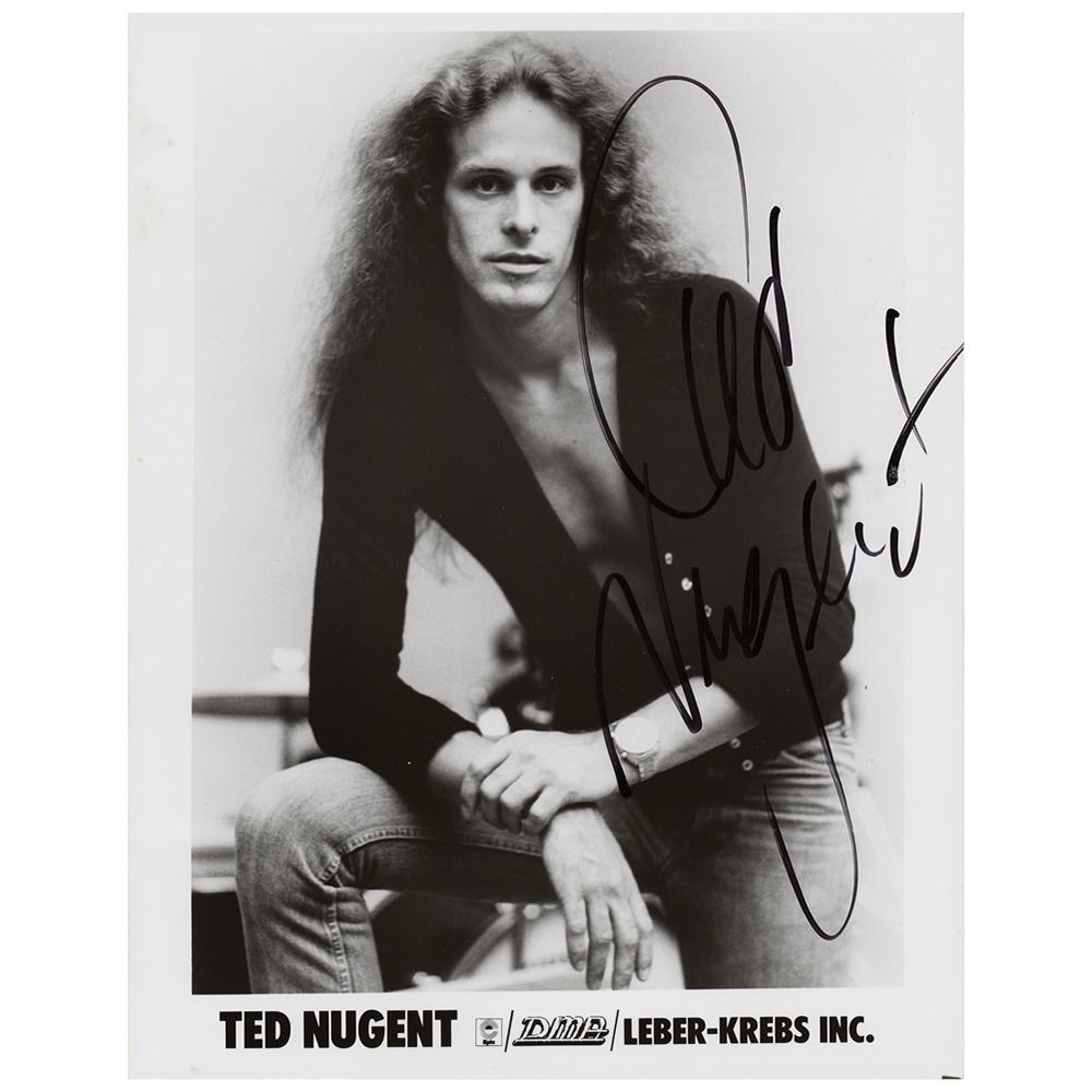Glossy 8 x 10 Leber-Krebs publicity photo of Ted Nugent, prominently signed in black felt tip by the controversial rocker. In fine condition.