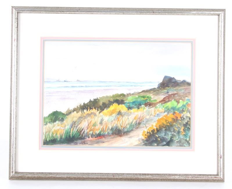 Featured in this lot is this sea shore scenic watercolor on board by Montana artist Ted Walters. The artwork is wonderfully and professionally crafted from watercolor on board construction that shows a scenic view of a sea shore that shows a rock face with a wave forming and fishing boats in the distance. The artist signature can be seen in the bottom left side of the artwork. The condition of this framed watercolor is good with no obvious signs of damage and shows good overall condition. The measurements of this framed watercolor is 16 1/2" x 20 1/4" and the visible art measures 9 3/4" x 13 3/4".