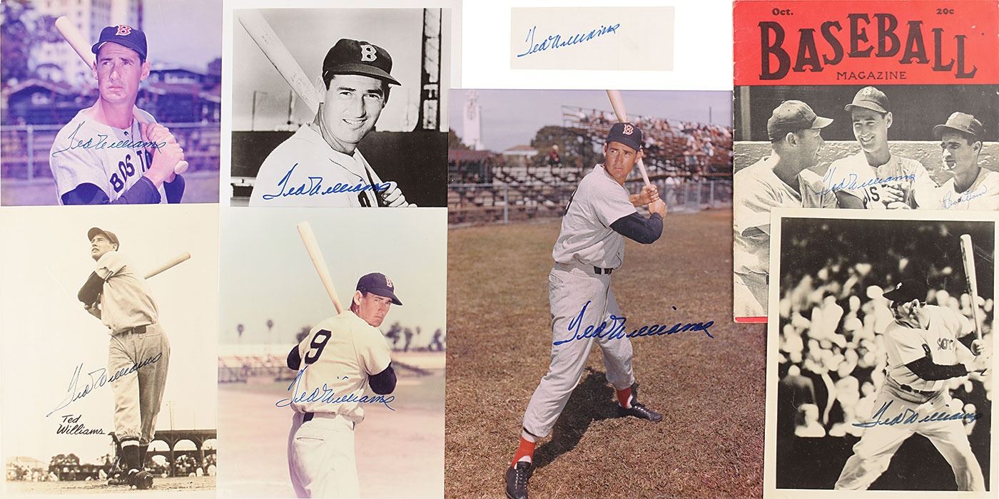 Very appealing group lot of eight items signed in blue or black felt tip by Ted Williams, including: five glossy 8 x 10 photos of the Red Sox Hall of Famer at various stages of his career, each showing Williams with bat in hand; a color satin-finish 11 x 14 full-length photo of Williams in his batting stance; an unused ticket for "Supershow 2, 'Yesterday's Heroes,' Ted Williams," held on June 23, 1989, signed on the reverse; and a copy of Baseball Magazine from October 1946, with front cover also signed by fellow Hall of Famer and Red Sox teammate Bobby Doerr. In overall fine condition.
