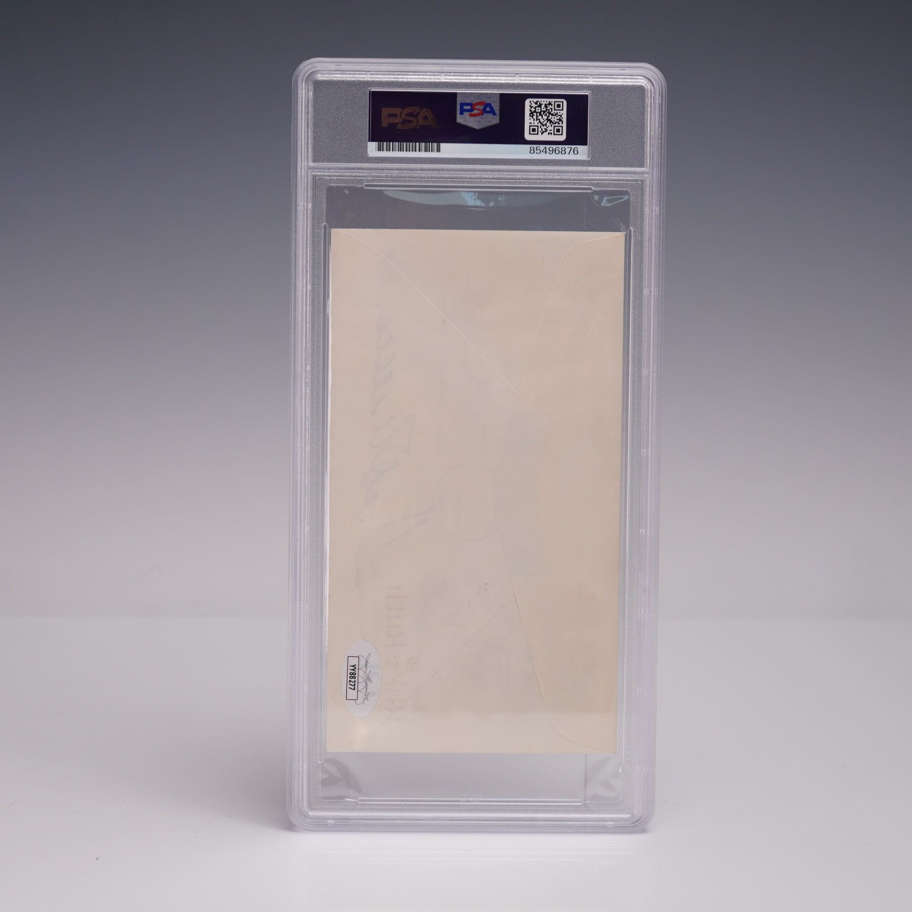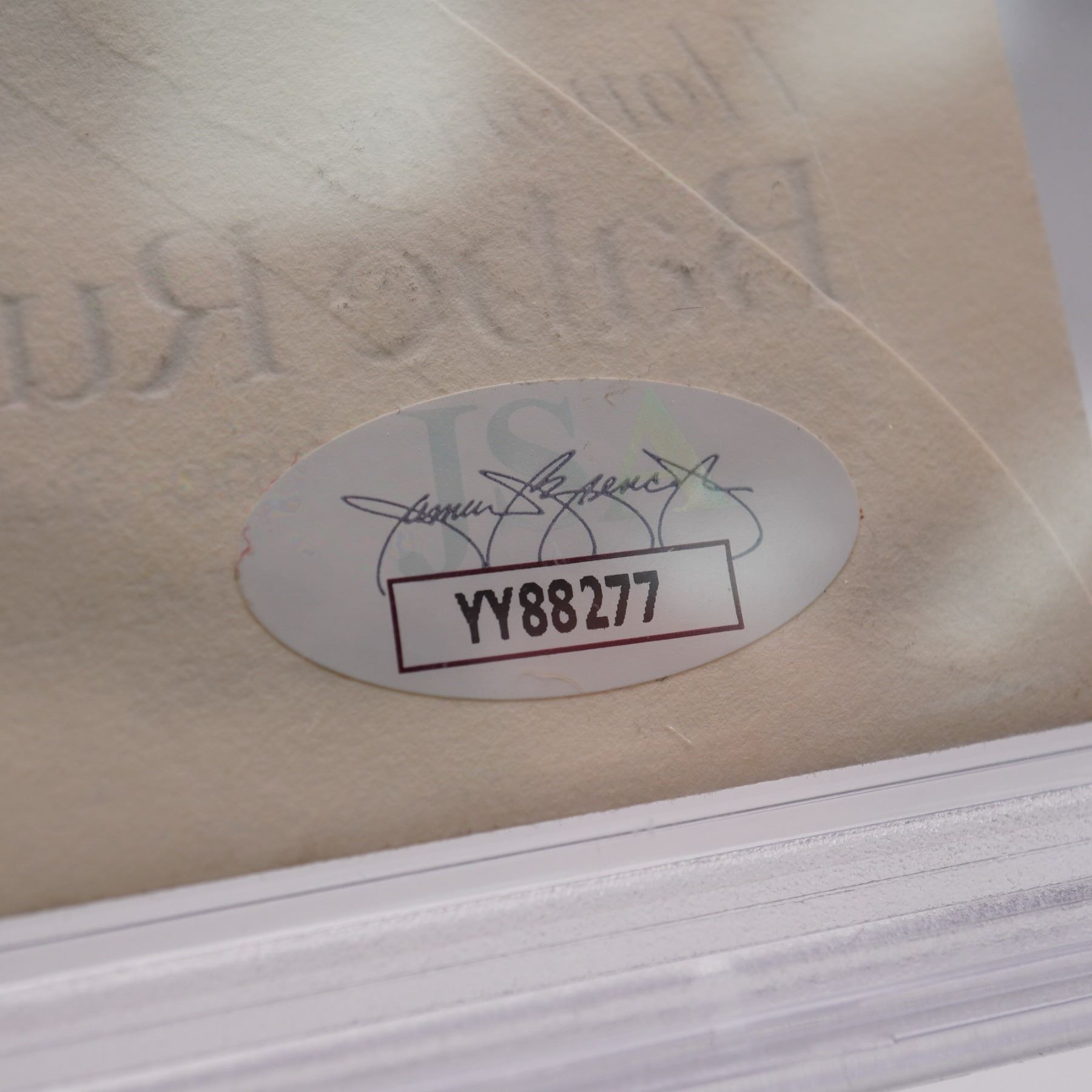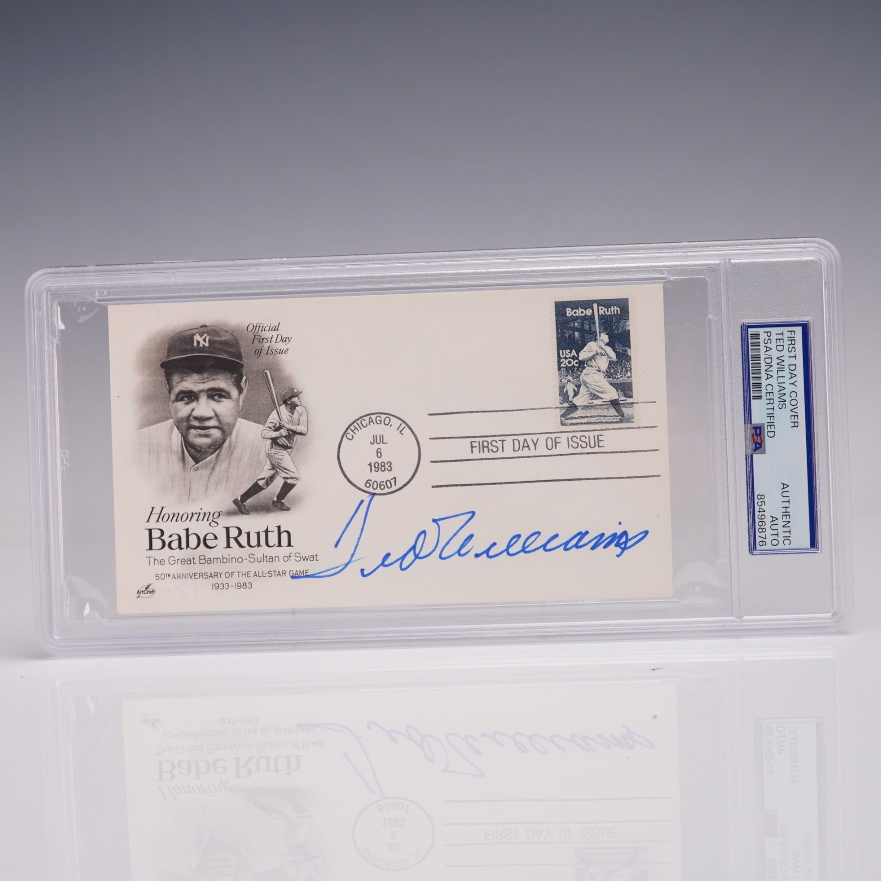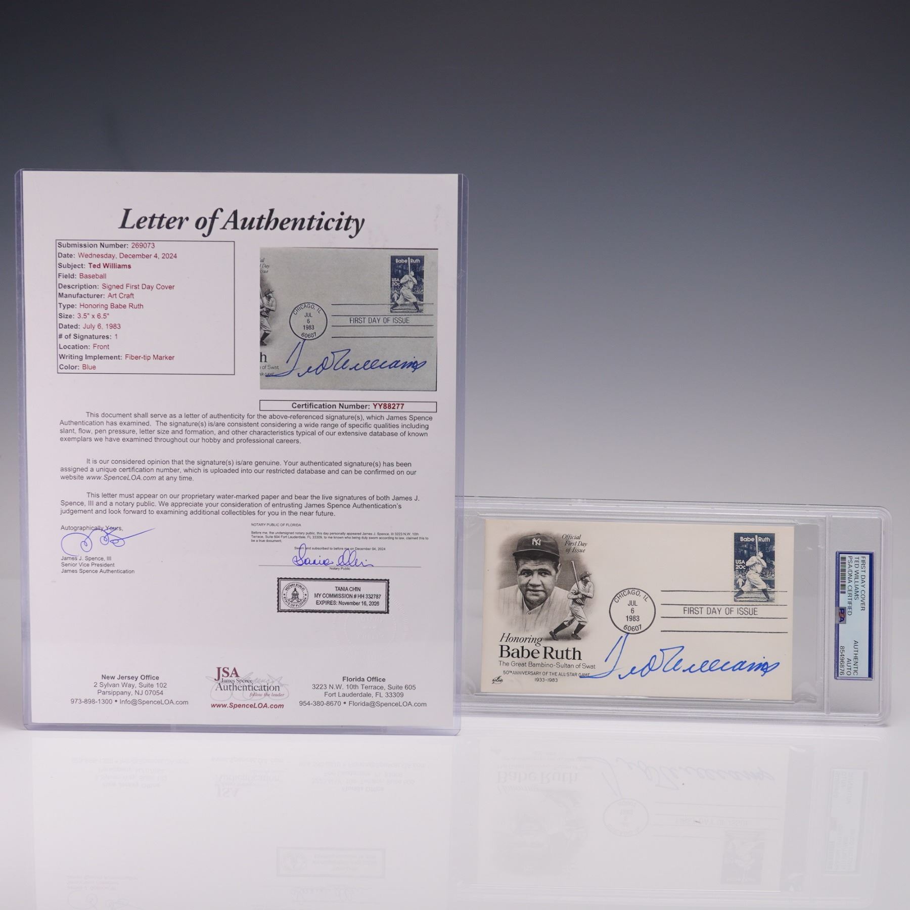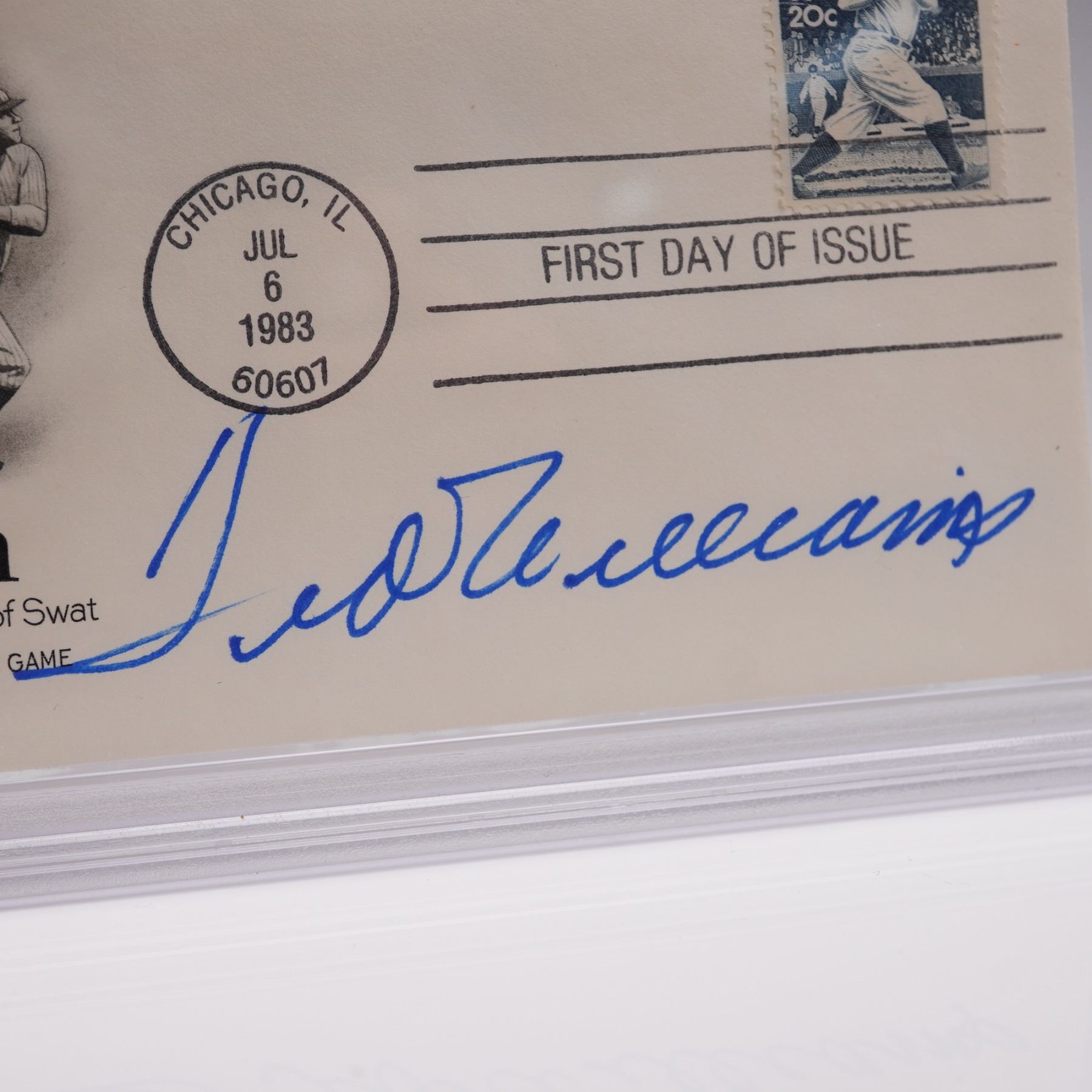 Ted Williams autographed 1983 First Day Cover (FDC) honoring Babe Ruth, signed boldly in blue fiber-tip marker. This collectible is authenticated by PSA/DNA and includes a full notarized Letter of Authenticity (LOA) from James Spence Authentication. This historic Art Craft First Day Cover, postmarked July 6, 1983, in Chicago, features a Babe Ruth commemorative stamp and celebrates two of the greatest legends in baseball history.