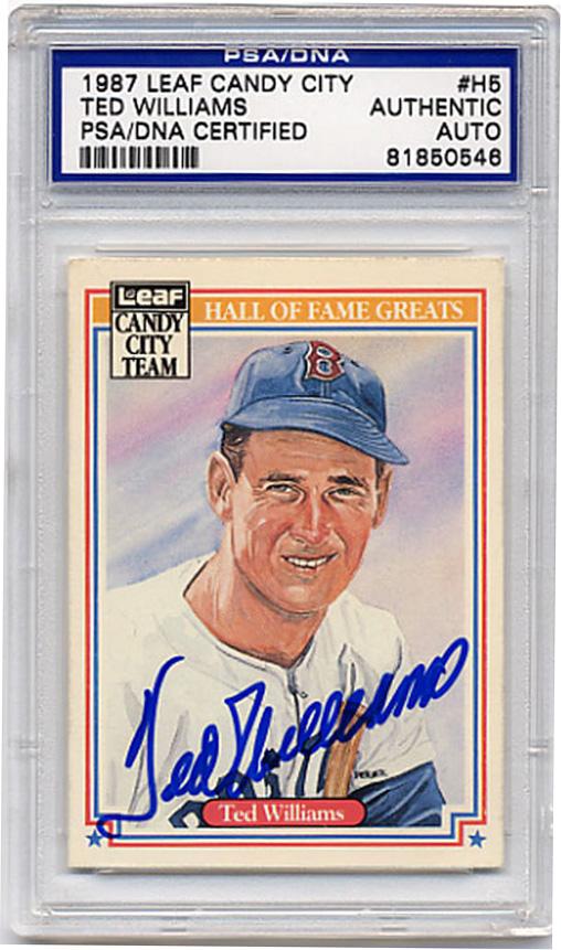 Ted Williams baseball card signed in bright blue Sharpie matching his Boston Red Sox baseball cap. Certified by PSA/DNA as authentic. Near fine condition.