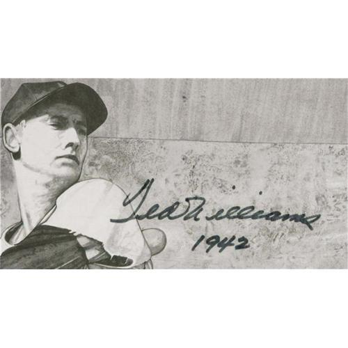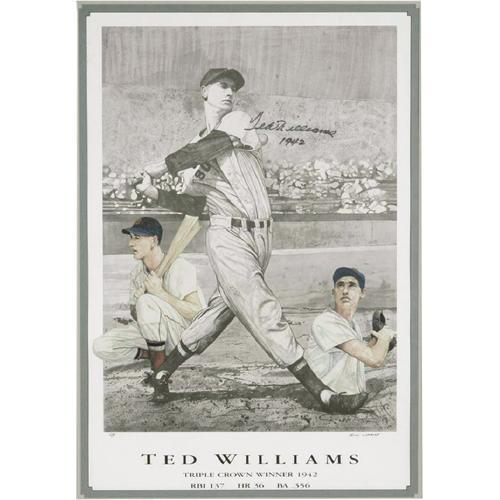<B>Ted Williams Signed Lithograph.</B></I> The legendary Red Sock's Triple Crown season is commemorated artfully with this large (22x33") litho picturing a youthful Williams at the height of his powers. Highly desirable black sharpie inscription "Ted Williams 1942" is a perfect 10/10. Signed by the artist, who notates it as an Artist's Proof. Masterfully matted and framed to 30x41". <I>LOA from PSA/DNA.</B></I> <BR><BR><B>Important notice:</B> Heritage usually auctions material at the rate of 200-250 lots per hour. On some occasions eBay Live bid software or the Internet may not be able to keep up with the pace of the auction. We recommend placing a realistic absentee bid now as insurance to avoid disappointment. Occasionally the auctioneer may eliminate or reject an eBay Live bid, and the auctioneer may also reopen a lot after the close of the eBay live bidding (usually because we missed an audience bid), and may reject your bid even if it shows you as the winning bidder. By bidding via eBay Live, you agree that Heritage may award the lot to another bidder at its sole discretion under the circumstances described above or any other reasonable circumstances. Since eBay bids are not shown to us until we open the lot on the floor, we treat those bids just like floor bids. In most cases the floor responds before the eBay bid is presented to us, due to Internet lag time, so for consistency we have made it a policy that floor bids are always considered first over tie eBay live bids. Also please note that all Heritage lots purchased through eBay Live carry a 22.5% Buyer's Premium. Please make sure you read the Terms and Conditions before you bid. This lot is being auctioned in conjunction with a live floor auction by Heritage Galleries & Auctioneers. All final auction and invoice information will be supplied by Heritage Galleries & Auctioneers, and all other information should be considered preliminary. Lot:19109 <BR><BR><B>Winning Notification and Billing:</B> After the FINAL session in this auction is complete, Heritage will send e-mail and snail mail invoices. This process normally takes several days. All final auction and invoice information will be supplied by Heritage Galleries & Auctioneers, and all other information should be considered preliminary. <BR><BR>This auction will be conducted on a live auction floor and over the Internet through eBay Live. If you choose to place an absentee bid, please take a moment to <font color='#0000ff'><u><a href='http://pages.ebay.com/liveauctions/help/before/laabsentee.html'>learn how eBay Live absentee bidding works</a></u></font><font color='#000000'>
