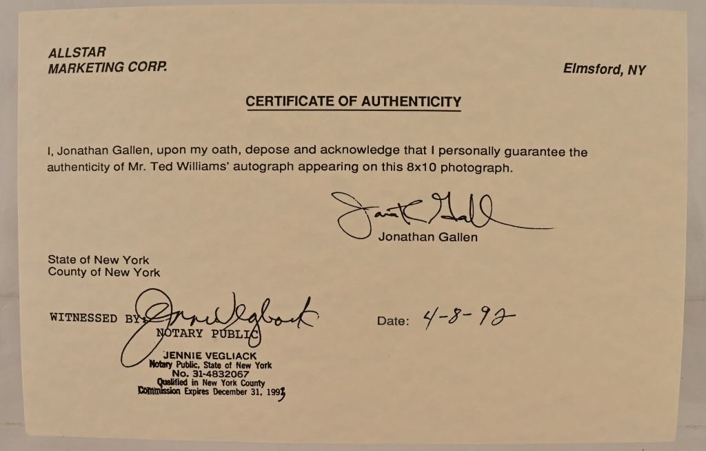 Ted Williams signed photo. Allstar authenticated. TR131