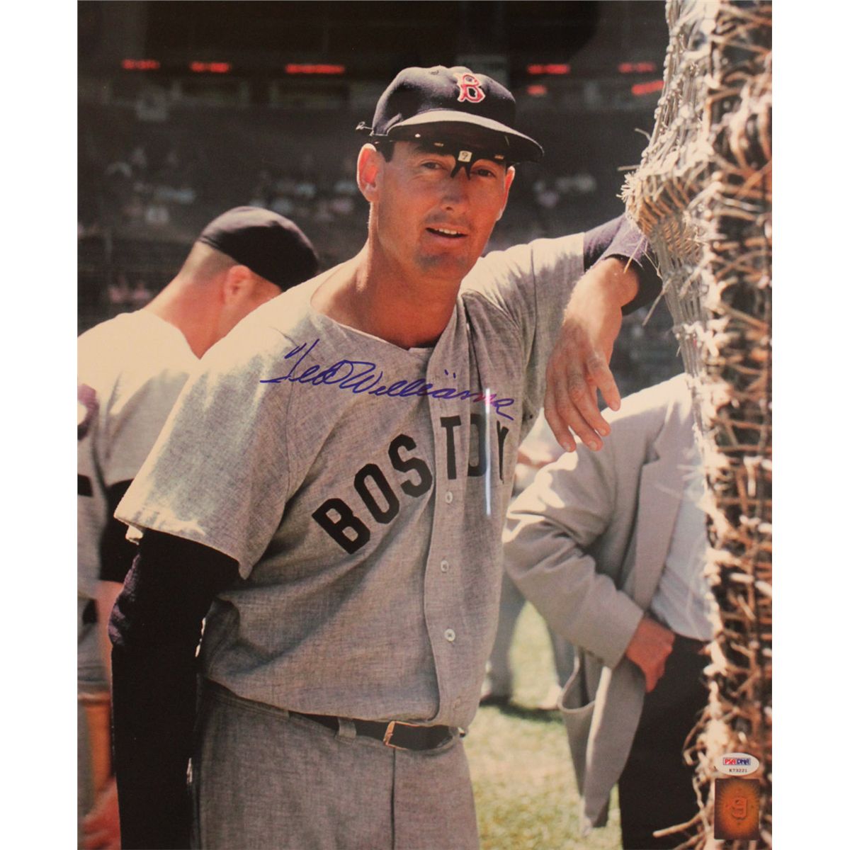 Extraordinarily large 16'' x 20'' photo signed by Boston Red Sox fielder Ted Williams. Glossy photo is signed in large writing ''Ted Williams'' in blue ink across his chest. With PSA/DNA COA, in near fine condition.