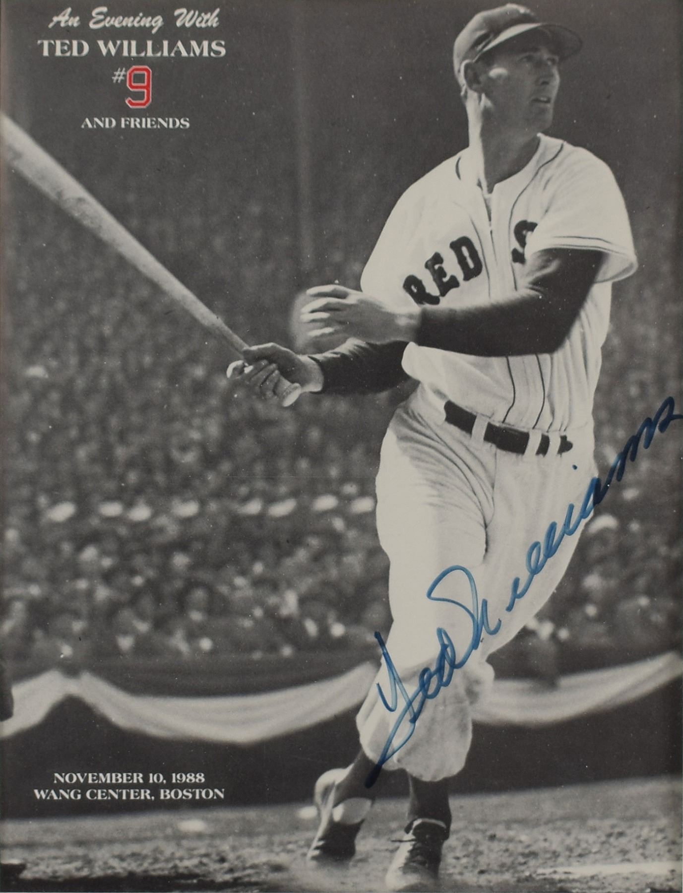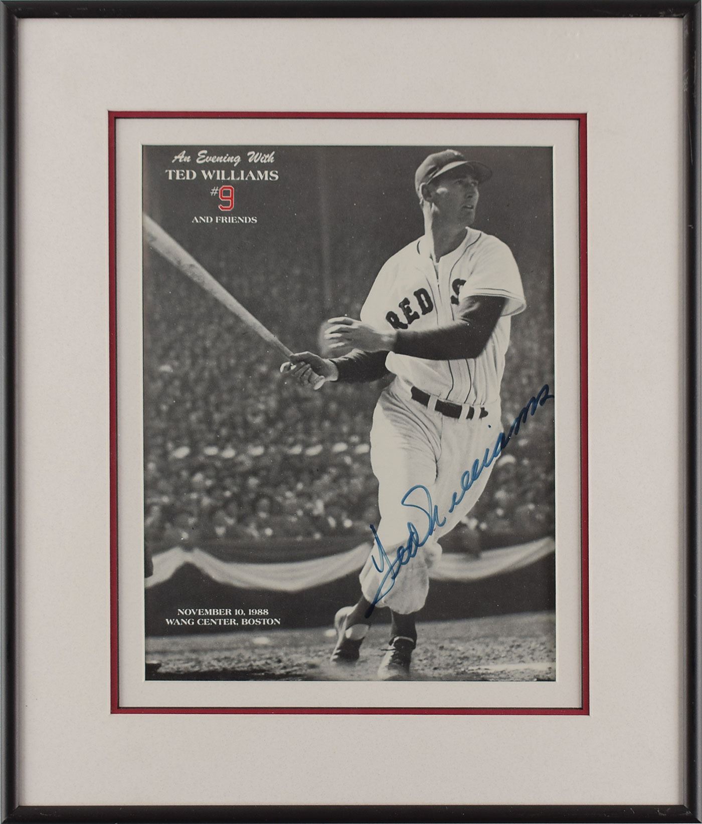 Program for "An Evening with Ted Williams and Friends" at Boston's Wang Center on November 10, 1988, 8 x 10.5, featuring a classic image of the Red Sox outfielder swinging, prominently signed in blue felt tip by Williams. Nicely triple-matted and framed using UV-protectant glass and acid free mats to an overall size of 13.75 x 16.25. In excellent condition. The consignor notes that the program is fully intact, without creases or tears to the pages.