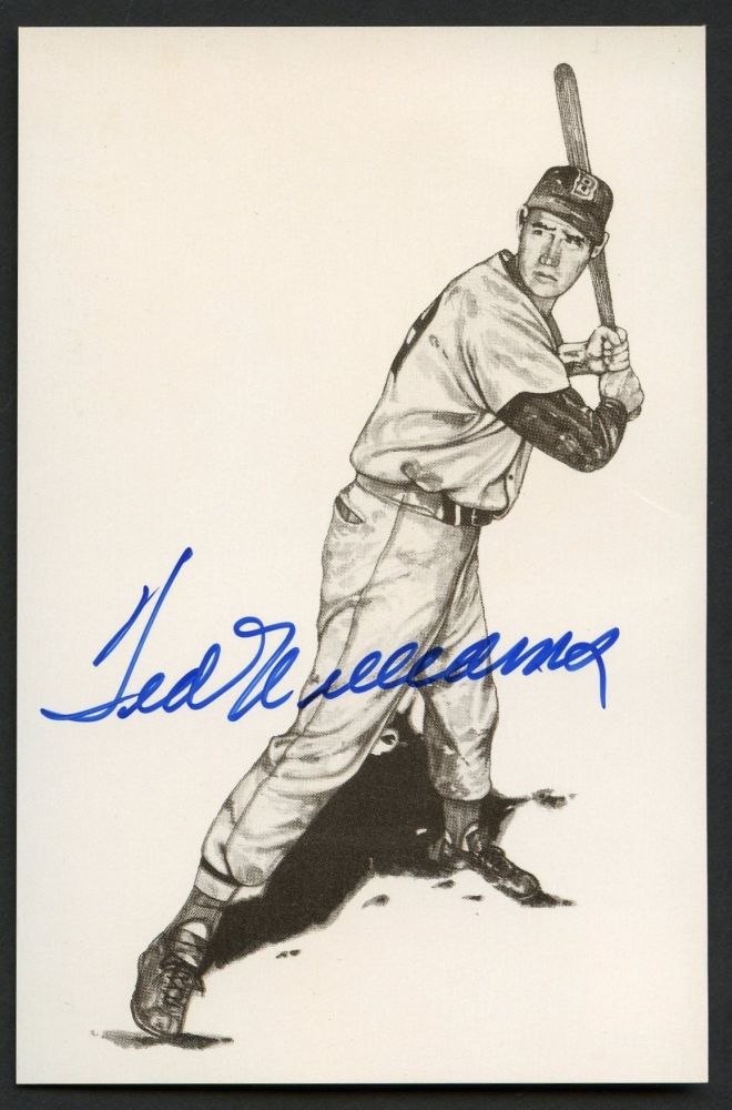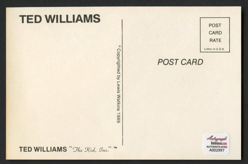 HOF poscard hand-signed in blue felt tip pen by Ted Williams (D 2002, HOF). Autograph includes an official Autograph Reference (AR) hologram for authenticity purposes.