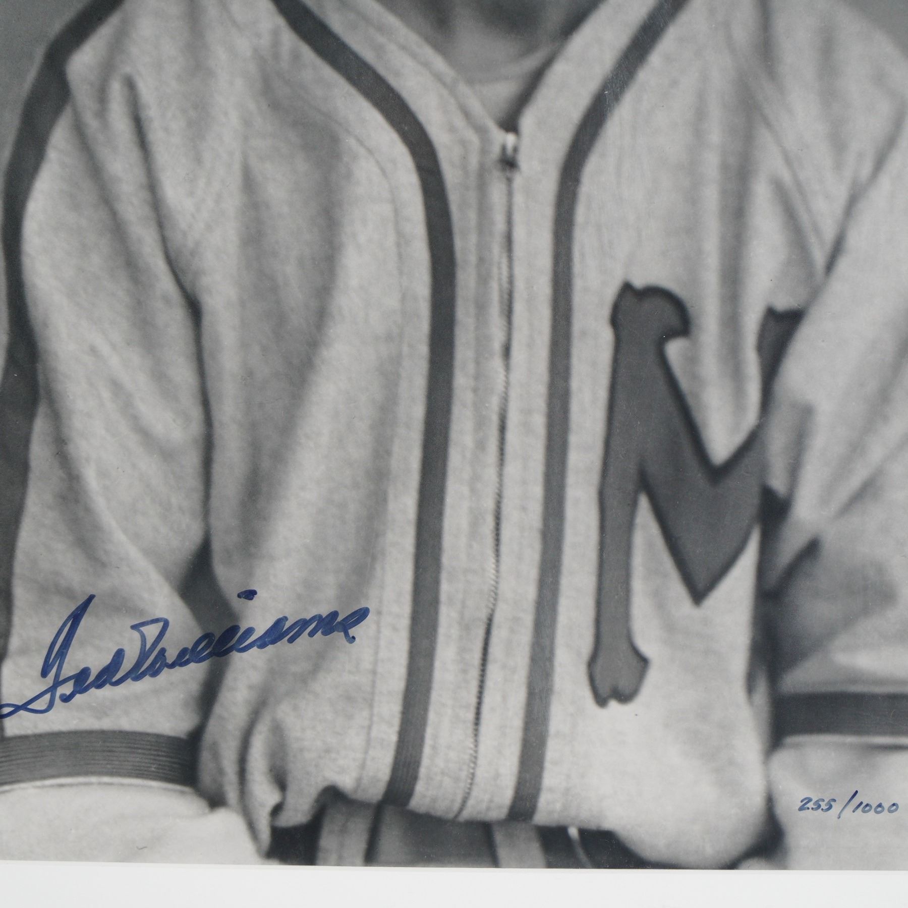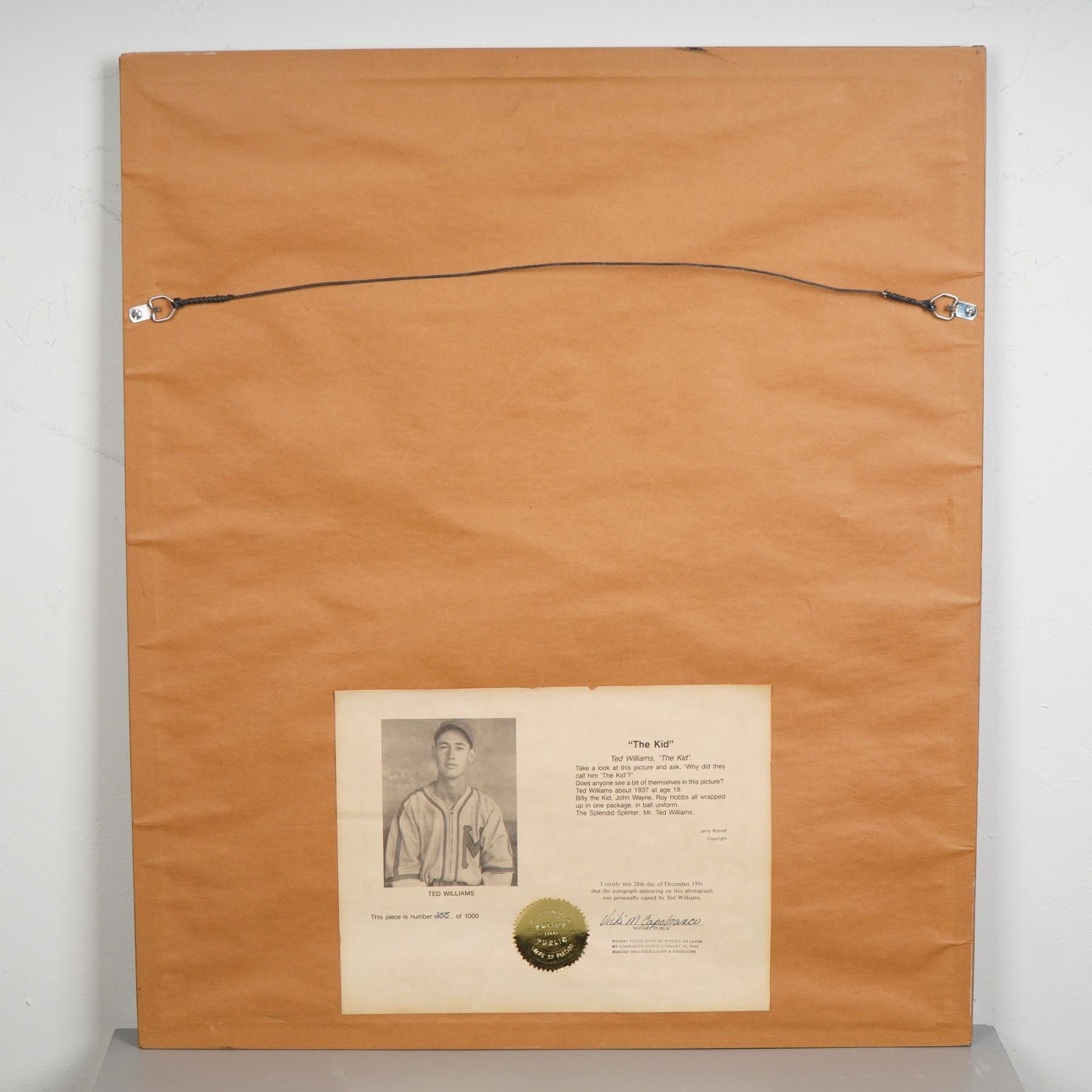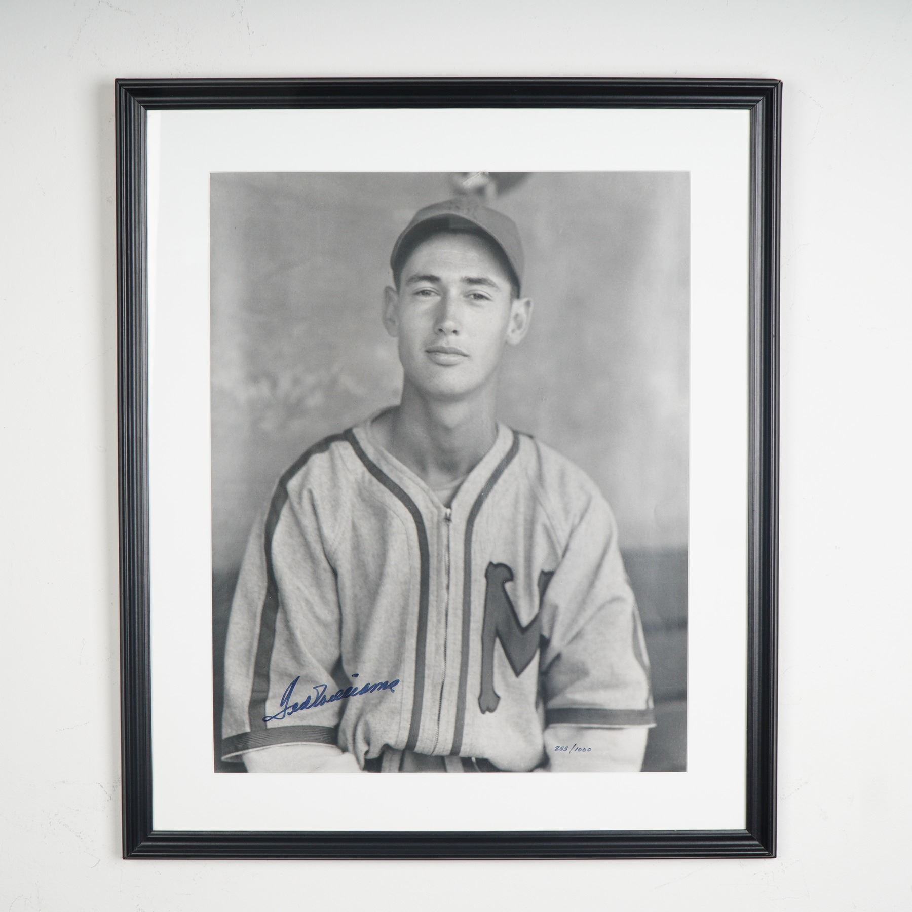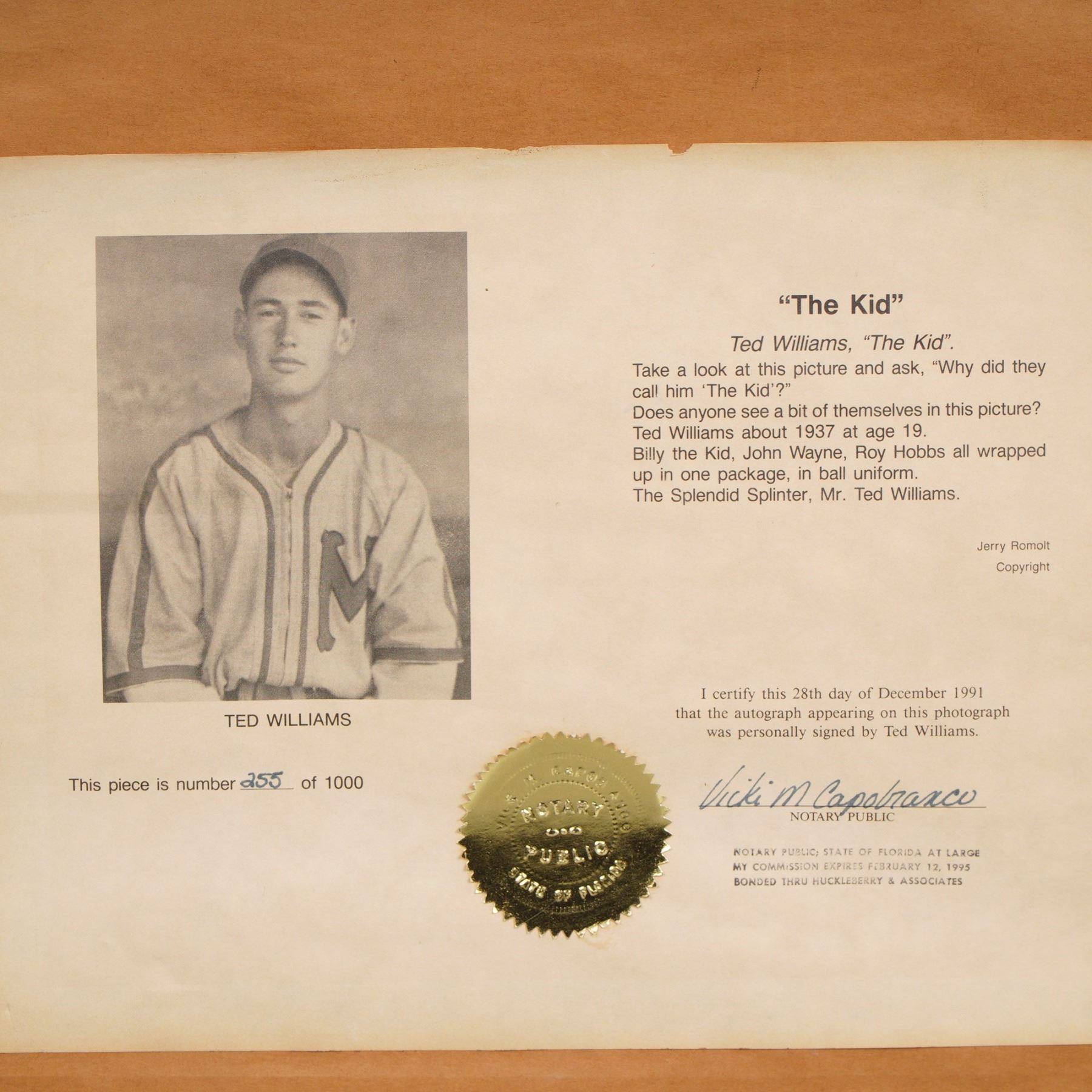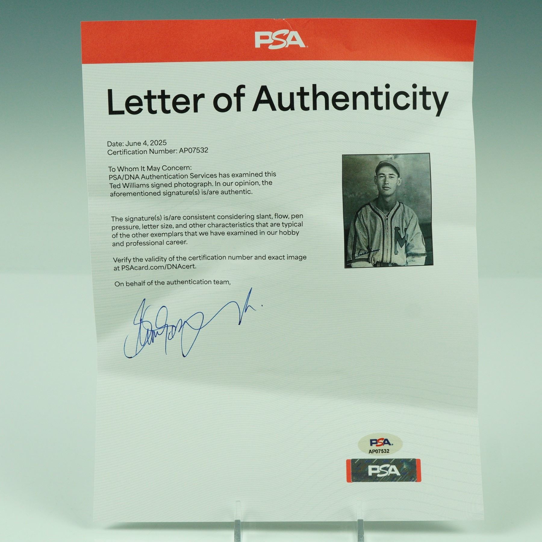 This striking limited edition framed photograph captures a young Ted Williams in 1937 at just 19 years old, wearing his Minneapolis Millers uniform before becoming a Boston Red Sox legend. Known as The Kid, The Splendid Splinter, and one of the greatest hitters in baseball history, Williams built a Hall of Fame career with a .344 lifetime batting average, 521 home runs, and two American League MVP awards. A nineteen-time All-Star, he famously served as a Marine Corps pilot in both WWII and the Korean War, sacrificing prime years of his career to serve his country. This black-and-white portrait is accompanied by both the original notarized certification dated December 28, 1991, and a modern PSA/DNA Letter of Authenticity (Cert. No. AP07532). Professionally framed and matted, this piece offers not just a rare autograph but a timeless glimpse at baseball's most celebrated pure hitter in his youth. Boldly signed in blue ink by Williams and numbered 255/1000.