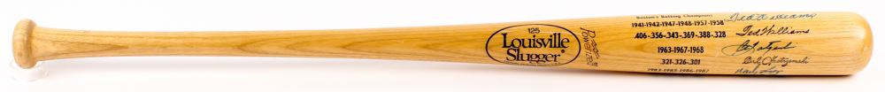 Louisville Slugger Player Model Powerized baseball bat. Hand-signed in blue felt-tip pen by Ted Williams (D. 2002, Boston Red Sox, HOF), Wade Boggs (Boston Red Sox, HOF), and Carl Yastrzemski (Boston Red Sox, HOF). Please note that a JSA LOA is included, but the matching hologram on the baseball bat is damaged.