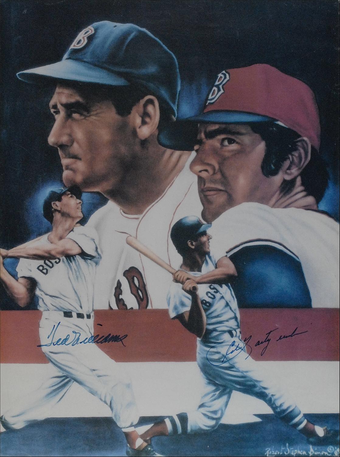 Color 18 x 24 composite print of the Red Sox legends, signed in blue felt tip by Ted Williams and Carl Yastrzemski. Rolled and in fine condition, with a few scattered edge dings and creases.