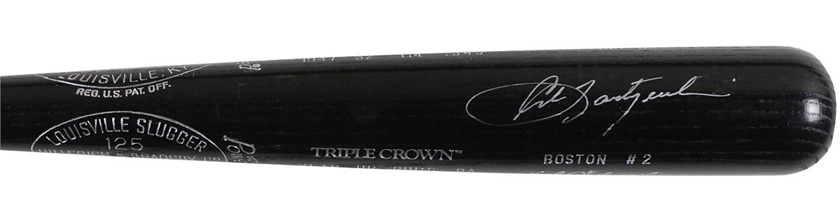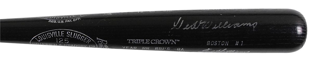 Official Louisville Slugger Williams and Yastrzemski statistic baseball bat signed in silver ink on the barrel by Ted Williams and Carl Yastrzemski. In very fine condition. Accompanied by a letter of authenticity from James Spence.