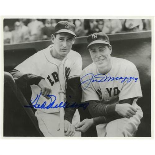 <B>Ted Williams and Joe DiMaggio Dual-Signed Photograph.</B></I> The embodiment of the Red Sox/Yankees rivalry of the 1940's is found in this photo of the Splendid Splinter and the Yankee Clipper posing at Fenway. Each has applied a 10/10 blue sharpie signature to the 8x10" black and white image. An essential component to any serious baseball autograph collection. <I>LOA from PSA/DNA.</B></I><BR><BR><b>Shipping:</b> Flat Material, Small (<a target="_blank" href="http://www.heritageauctions.com/common/shipping.php">view shipping information</a>)