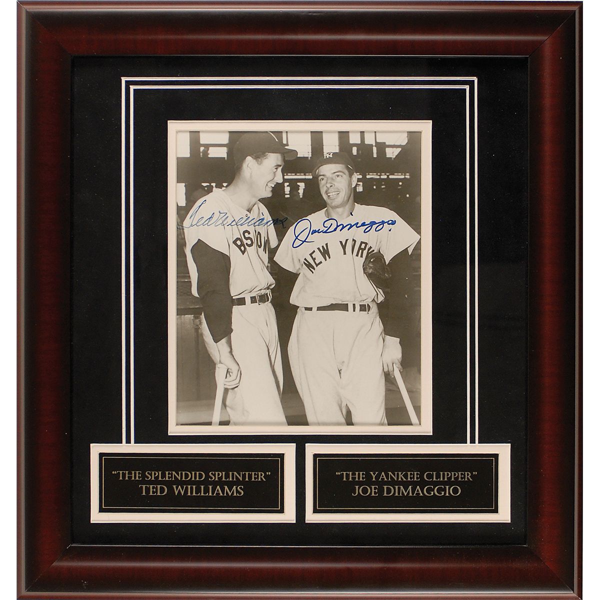 Glossy 7.25 x 8.75 photo of Williams and DiMaggio joking around, signed in blue felt tip by both. Double matted and framed with engraved nameplates to an overall size of 17 x 18. Scattered surface creases, otherwise fine condition. Accompanied by a full letter of authenticity from JSA.
