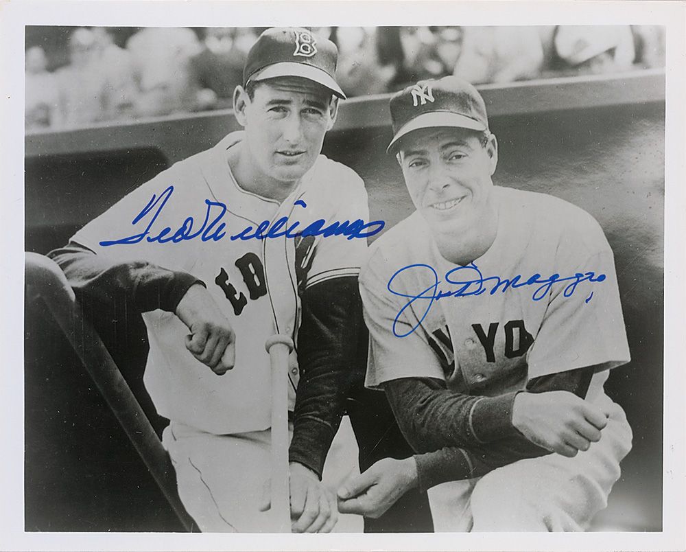Glossy 10 x 8 photo of Williams and DiMaggio posing together in the dugout before a game, signed in blue felt tip by both Ted Williams and Joe DiMaggio. In fine condition, with a bit of trivial spotting to finish.