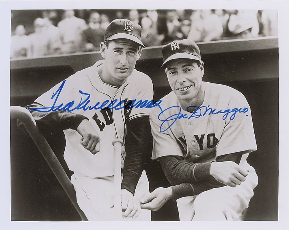 Glossy 10 x 8 photo of Williams and DiMaggio posing together in the dugout before a game, signed in blue felt tip by both Ted Williams and Joe DiMaggio. In fine condition.