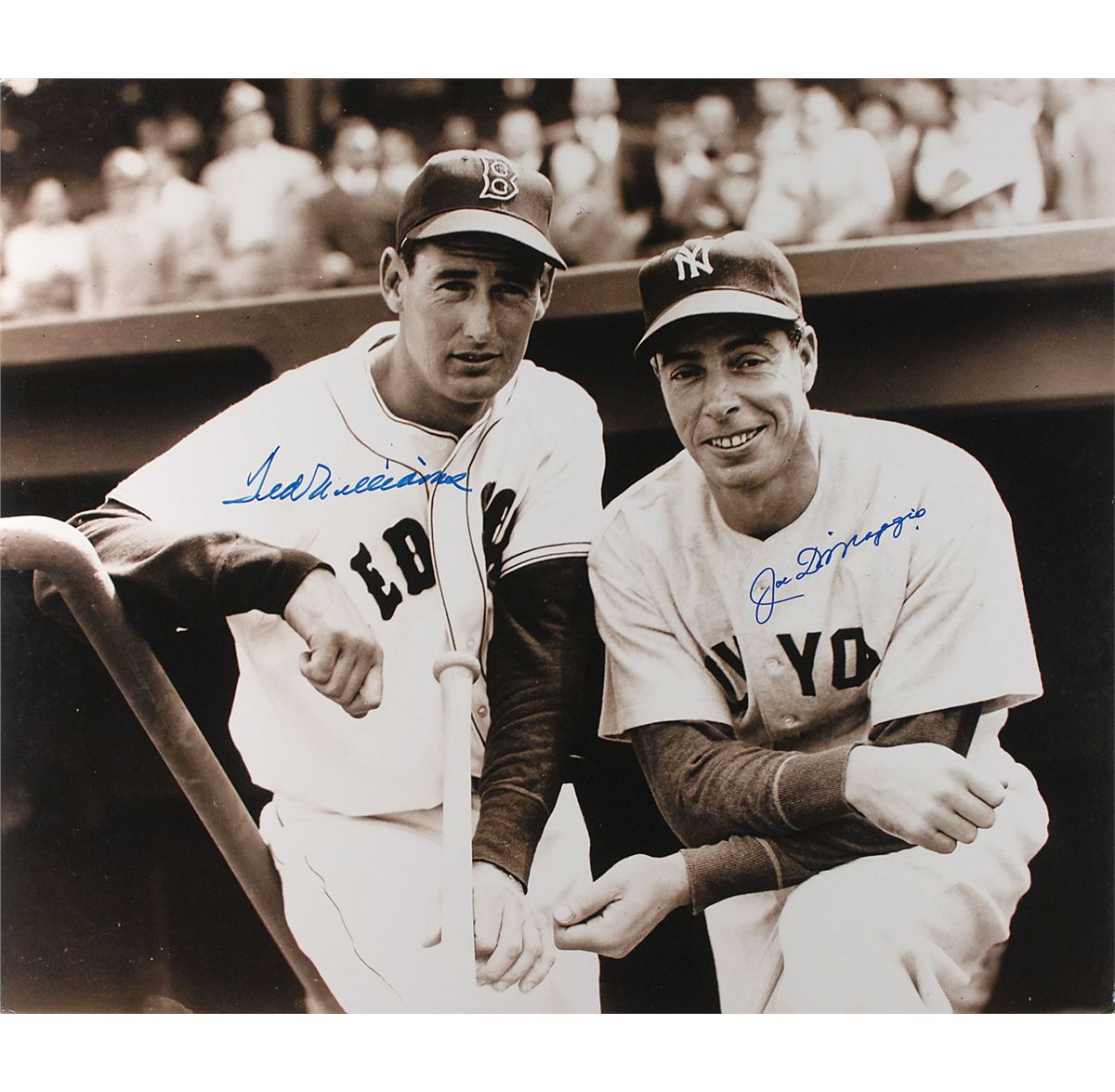 Exquisite semi-glossy 23.75 x 20 photo of Williams and DiMaggio posing together on the dugout steps from the Brearley Collection, signed in blue felt tip by both. Stamped and signed on the reverse by Brearley with a 1978 copyright. In fine condition.