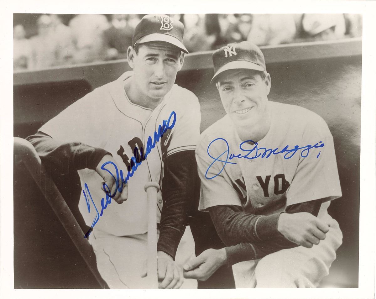 Wonderful glossy 10.25 x 8.25 photo of rivals Ted Williams and Joe DiMaggio posing in their respective uniforms, signed in blue felt tip by both. In fine condition.