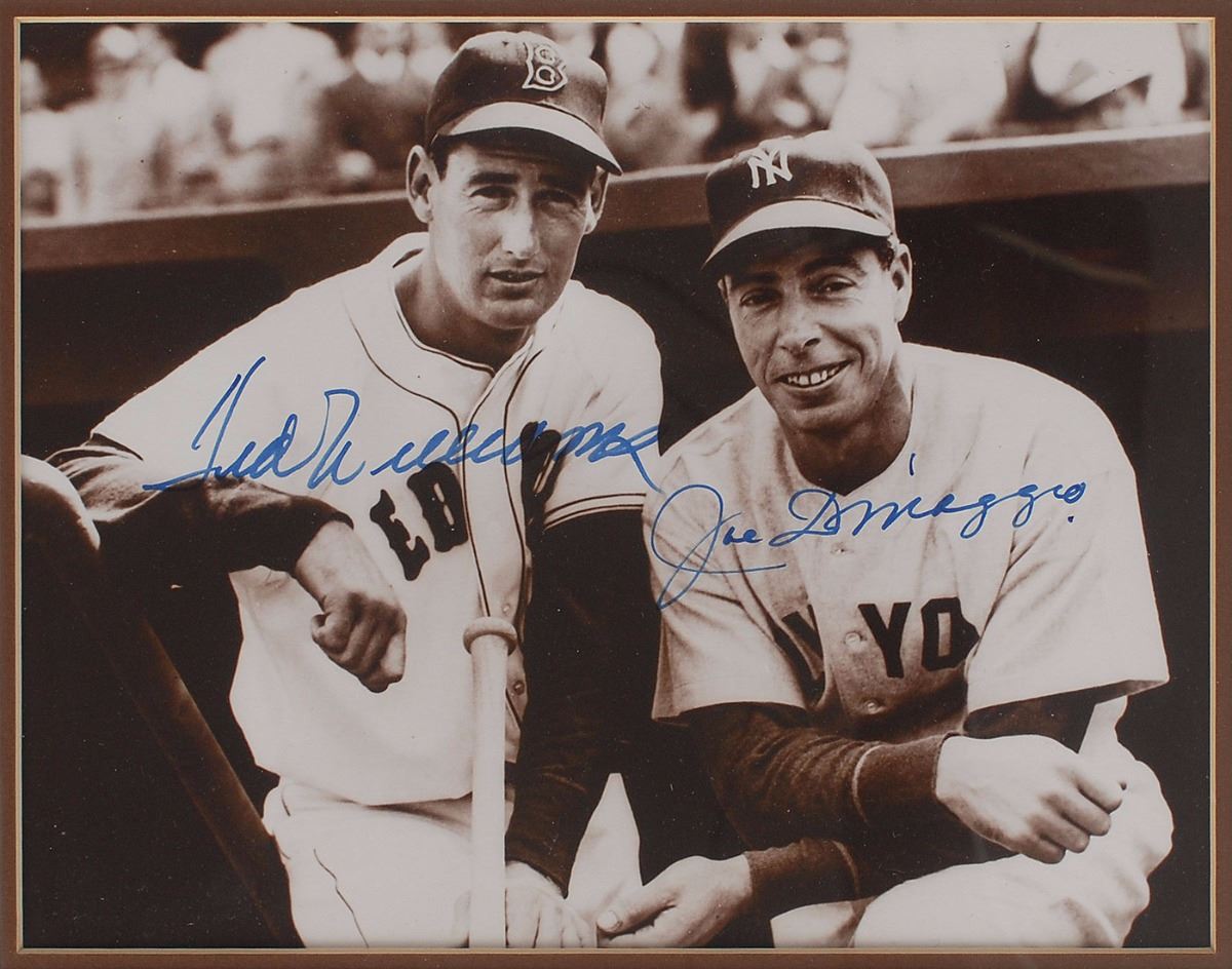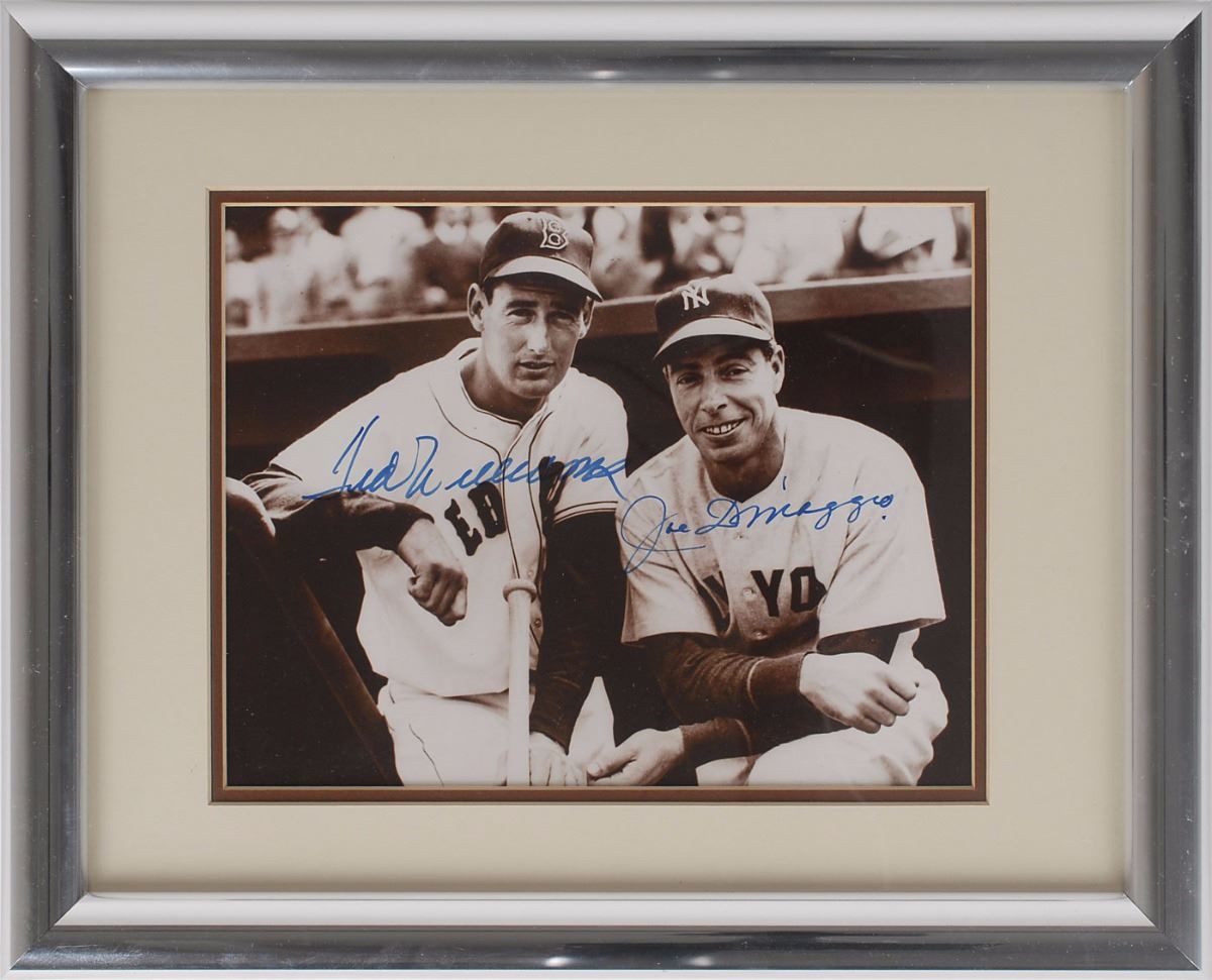 Ideal matte-finish 9.5 x 7.25 photo of rivals Ted Williams and Joe DiMaggio posing in their uniforms, signed in blue felt tip by both. Double-matted and framed to an overall size of 15.5 x 12.5. In fine condition.