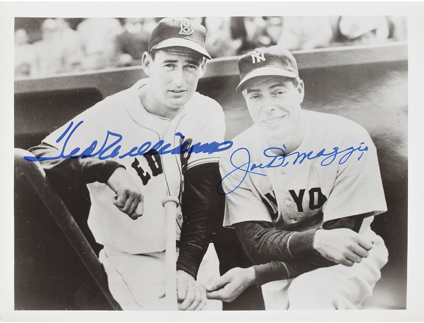 Glossy 10.25 x 8.25 photo of Ted Williams and Joe DiMaggio posing side-by-side in their respective Red Sox and Yankees uniforms, signed in blue felt tip by both. In fine condition.