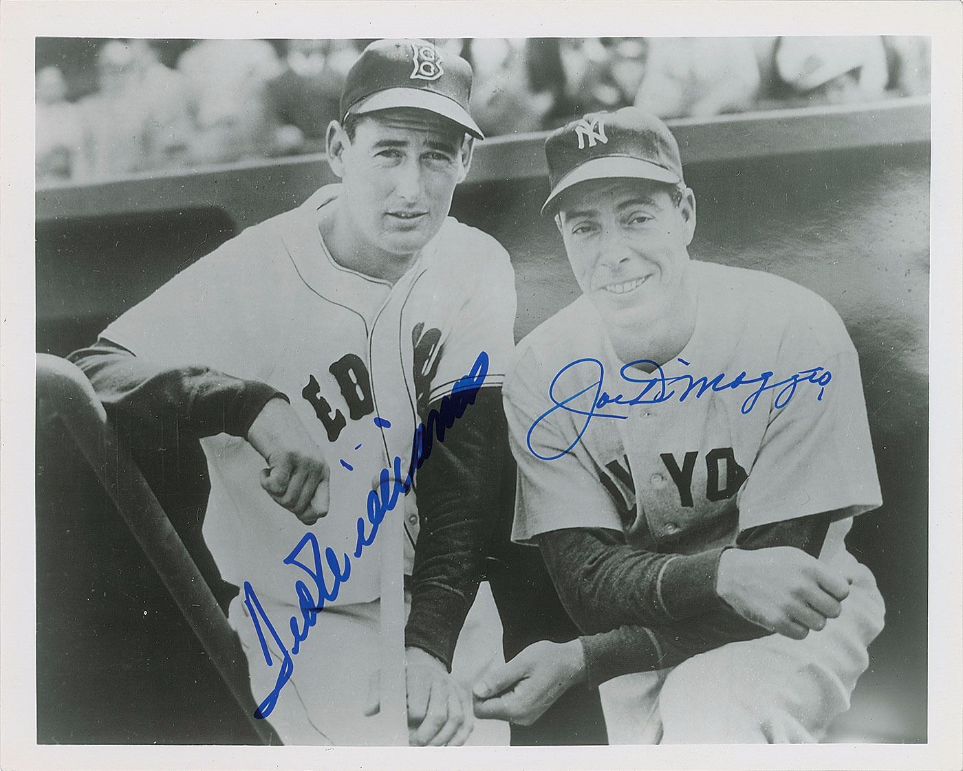 Choice glossy 10 x 8 photo of Ted Williams and Joe DiMaggio together, signed in blue felt tip by both. In fine condition.