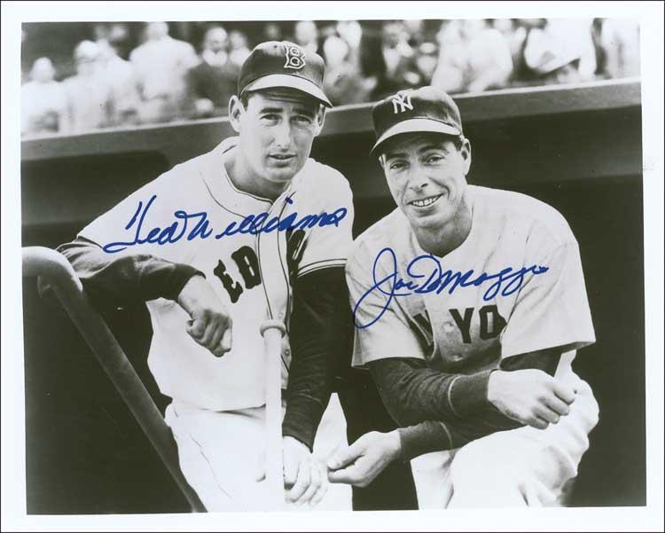Glossy 10 x 8 photo of Ted Williams and Joe DiMaggio posing together on the dugout steps, signed in blue felt tip by both Williams and DiMaggio. In very fine condition. Pre-certified Steve Grad/PSA/DNA and RRAuction COA.