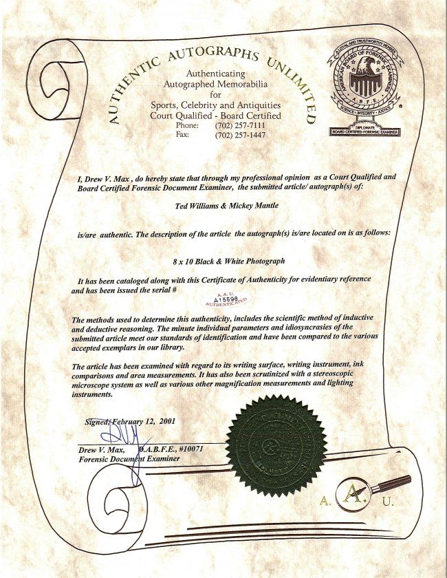 Ted Williams and Mickey Mantle Signed 8 x 10 Photograph Certified by AAU