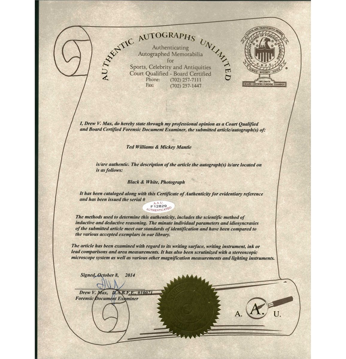 Ted Williams and Mickey Mantle Signed Photograph AAU