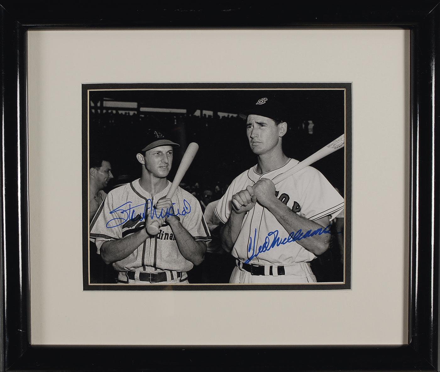 Glossy 9.25 x 7.25 photo of of the two Hall of Famers posing together with their bats, undoubtedly at an All-Star Game, neatly signed by both in blue felt tip. Double-matted and framed to an overall size of 16 x 14. In fine condition.