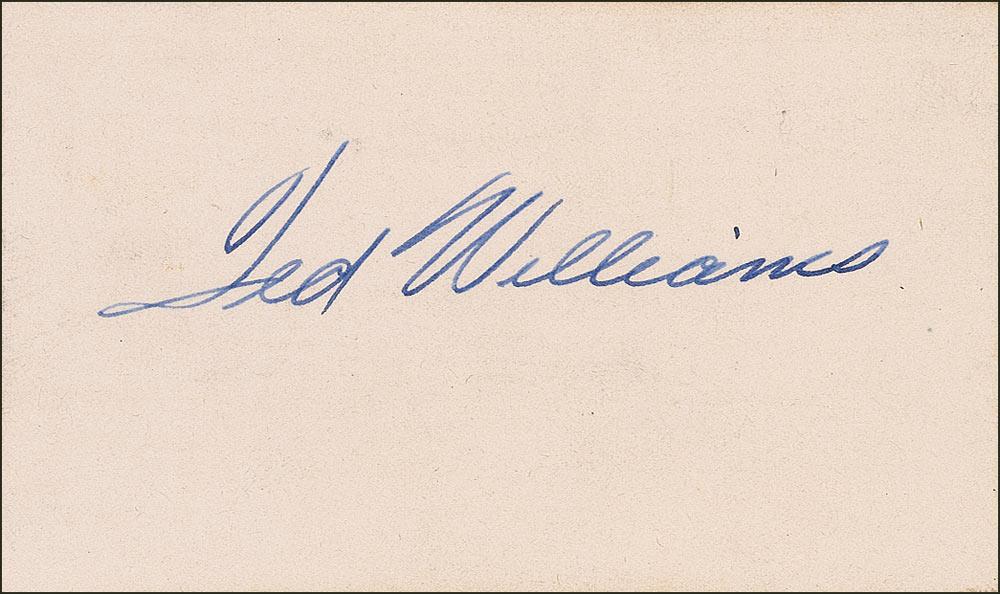 Early vintage ballpoint signature, “Ted Williams,” on an off-white 3.5 x 2 card. In fine condition.