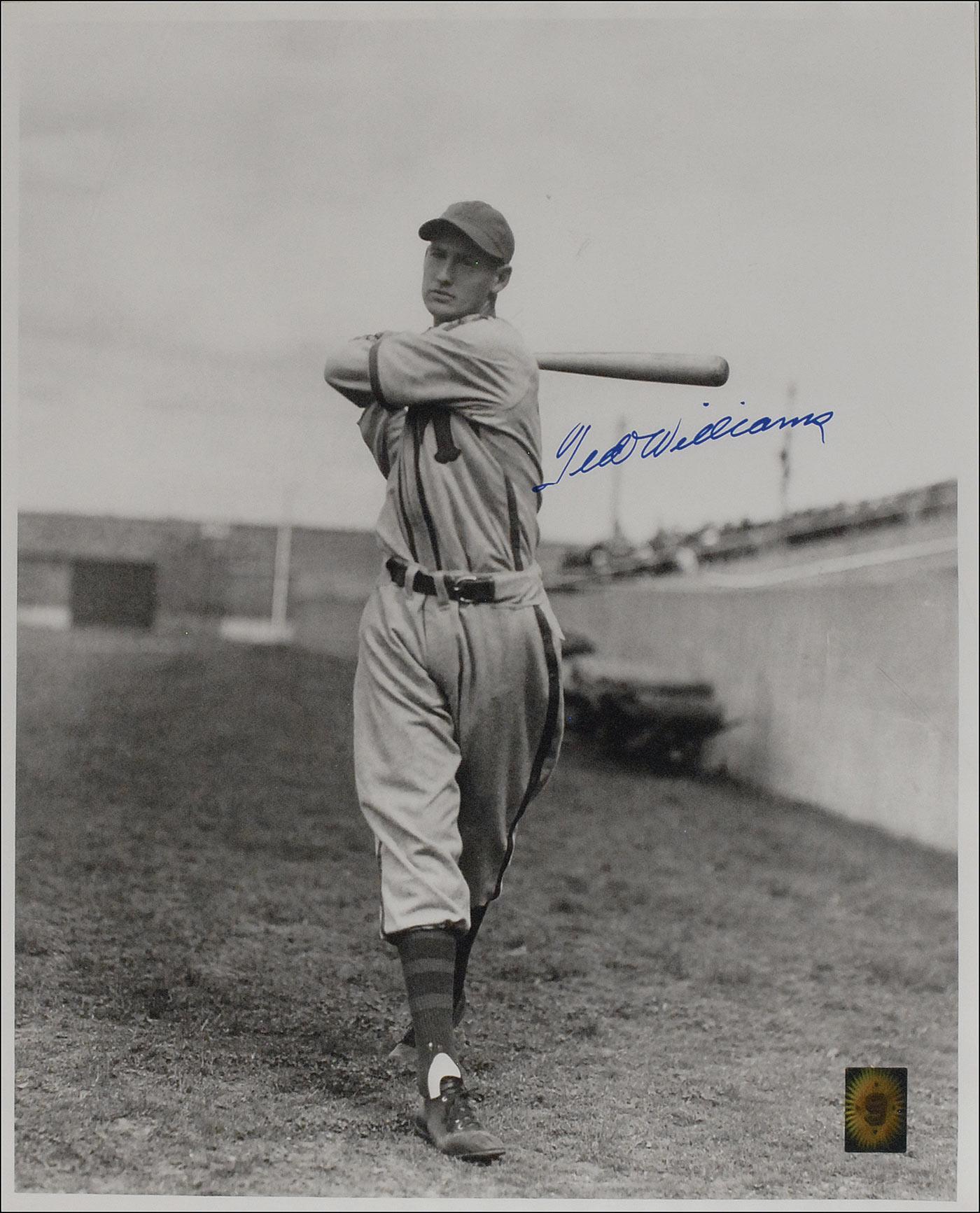 Oversized 16 x 20 semi-glossy photo of Williams taking a practice swing in his Minneapolis Millers uniform, signed in blue felt tip. Some scattered light surface creases, and curling to horizontal edges from having previously been rolled, otherwise fine condition. Farmed out to Minneapolis of the American Association in 1938, Williams posted spectacular numbers. He won the league’s Triple Crown with a .366 average, 43 homers and 142 RBIs.