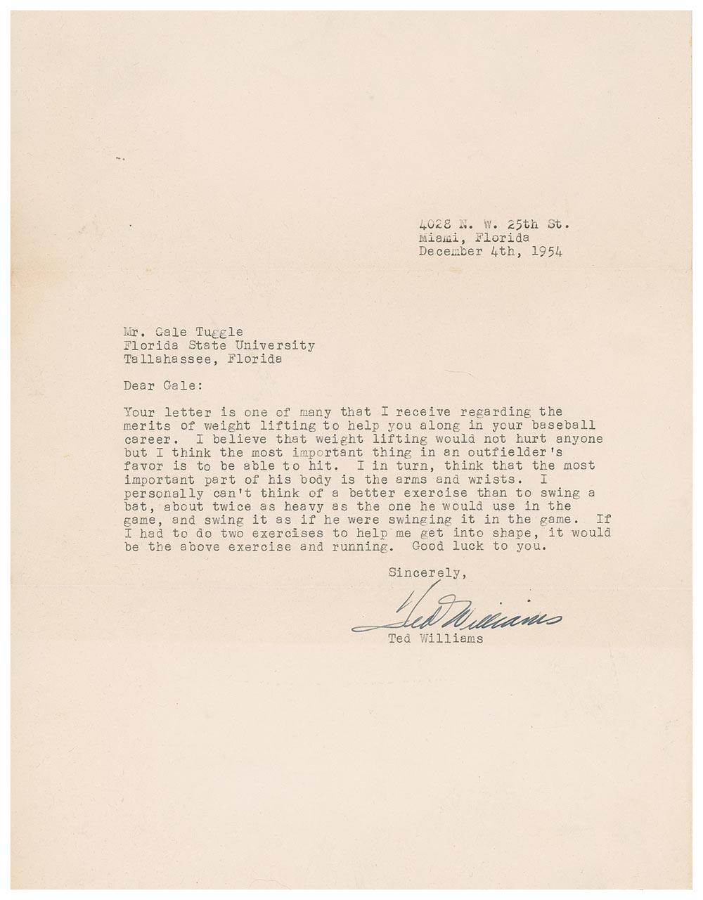 TLS, one page, 8.5 x 11, December 4, 1954. Williams writes Gale Tuggle at Florida State University regarding the merits of weight lifting to aid a baseball career. “I believe that weight lifting would not hurt anyone but I think the most important thing in an outfielder’s favor is to be able to hit. I in turn, think that the most important part of his body is the arms and wrists. I personally can’t think of a better exercise than to swing a bat, about twice as heavy as the one he would use in the game, and swing it as if he were swinging it in the game. If I had to do two exercises to help me get into shape, it would be the above exercise and running.” A couple of creases, wrinkling, a horizontal fold touching the top letter of his first name, and some toning, a bit heavier along the far left edge, otherwise fine condition. Accompanied by the original mailing envelope. Sound advise from one of baseball’s greatest hitters!