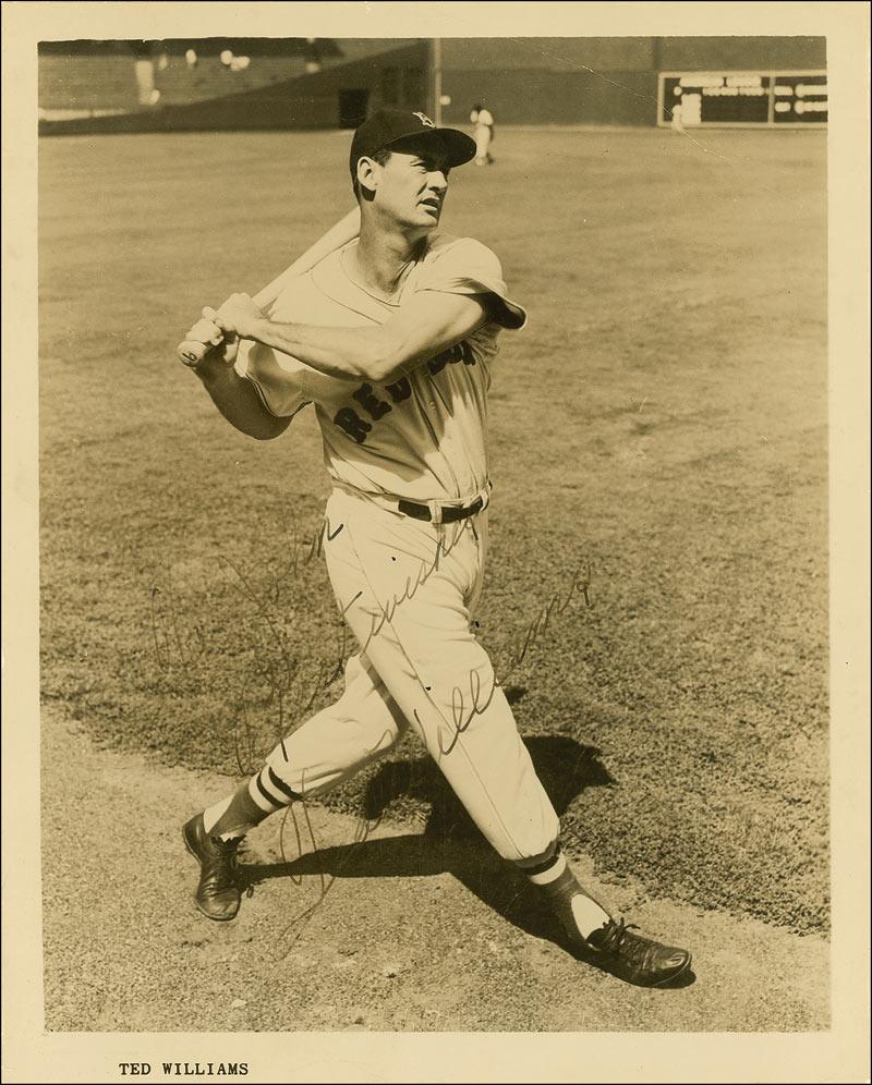 Vintage glossy 8 x 10 photo of Williams taking a practice cut at Fenway Park, signed and inscribed in black ink “To John, Best wishes, Ted Williams.” Signature a shade or two light, with inscription and sentiment fairly light due to contrast against background, and scattered creases, heavier to top right, otherwise very good condition.