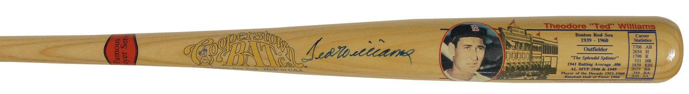 Official Cooperstown Bat Co. Ted Williams commemorative baseball bat, bearing an image of Williams and his career statistics, signed in blue felt tip on the barrel. In fine condition.