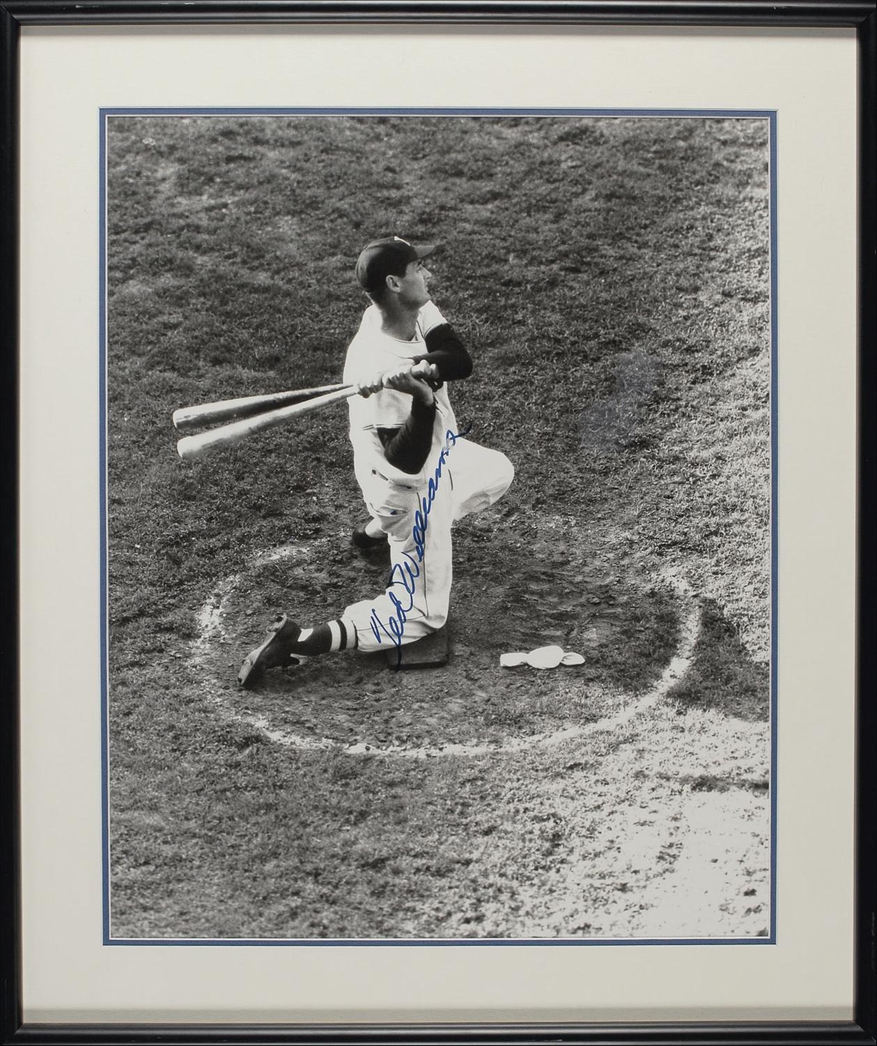 Satin-finish 16 x 20 photo of Williams swinging two bats in the on-deck circle, signed in blue felt tip. Double matted and framed to an overall size of 21 x 25. In fine condition, with a small brush to last letter of signature. Oversized.