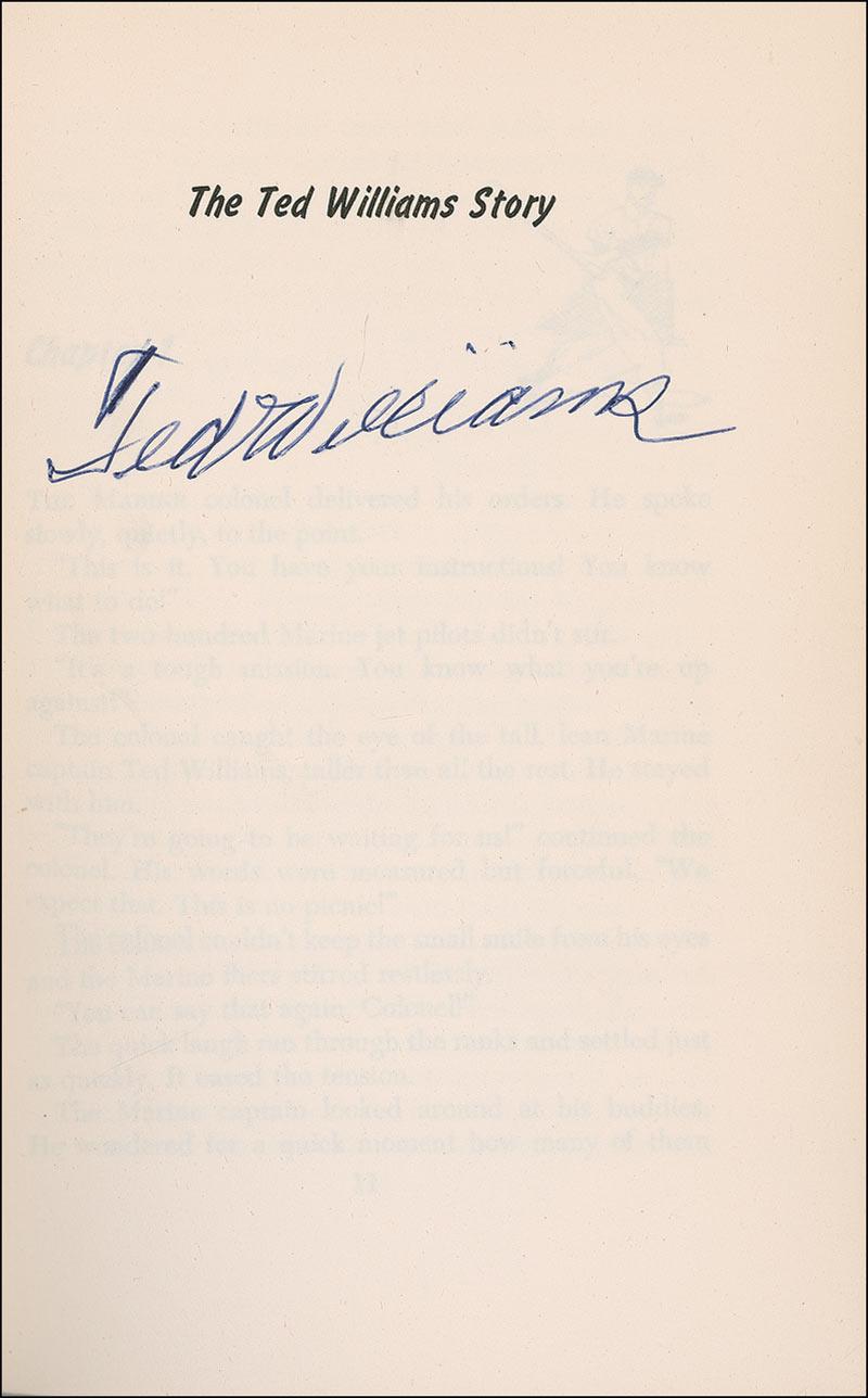 Signed book: The Ted Williams Story. First edition, first printing. NY: Julian Messner, 1954. Hardcover with dustjacket, 5.75 x 8.5, 188 pages. Signed on the half-title page in blue ballpoint. Accompanied by a certificate of authenticity from Ted Williams Family Enterprises, Ltd. In fine condition, with some scattered light wear and surface loss to edges of dustjacket, and a bit of mild edge toning to some inside pages.