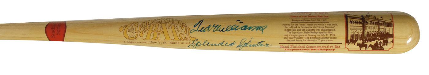 Official Cooperstown Bat Co. Fenway Park commemorative baseball bat signed in blue felt tip on the barrel, “Ted Williams Splendid Splinter.” In fine condition.