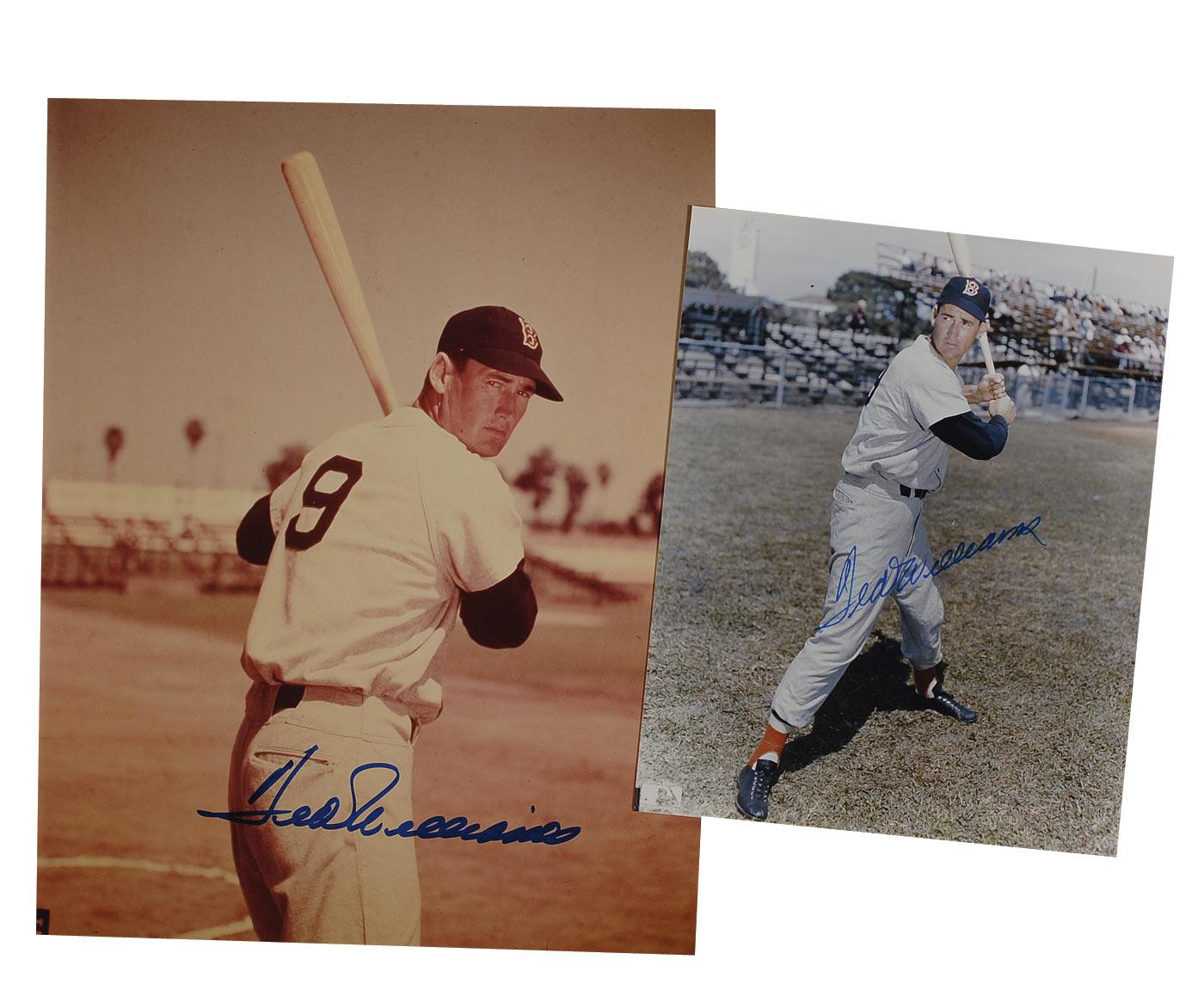 Two color glossy photos of Williams during batting practice, one 8 x 10 and one 11 x 14, each signed in blue felt tip. In fine condition with a few scattered bends.