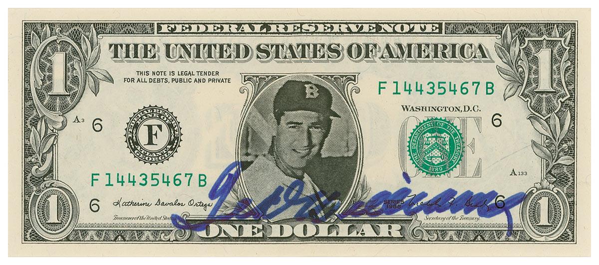Crisp Series 1988 one dollar bill, boldly signed on the portrait side in felt tip by Ted Williams. Williams’s likeness has been carefully placed over that of George Washington. In fine condition. Accompanied by a full letter of authenticity from James Spence Authentication.