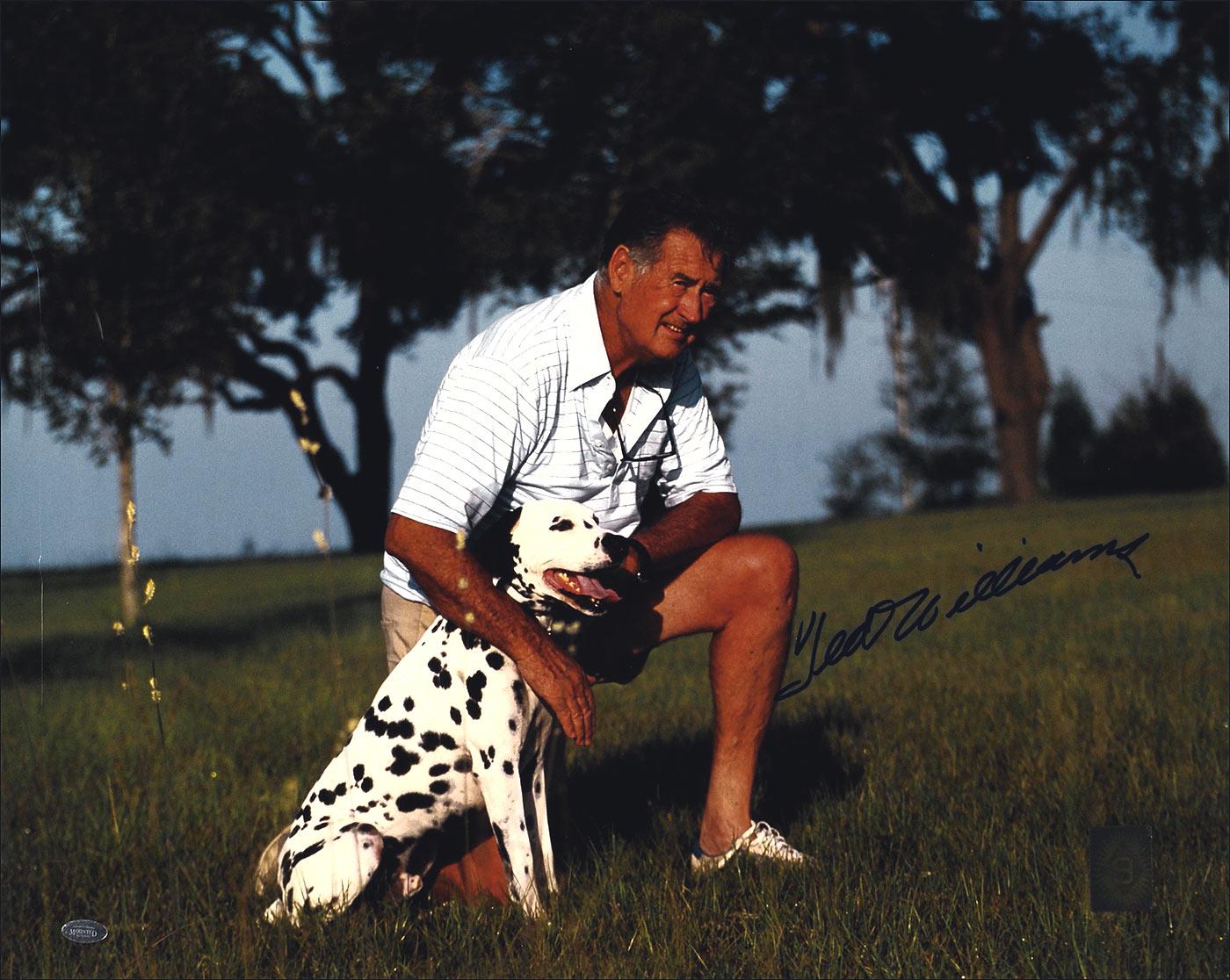 Color glossy 20 x 16 photo of an older Williams posing outdoors with a dalmatian, signed in blue felt tip. In fine condition, with two holograms affixed to bottom. Accompanied by a certificate of authenticity from Green Diamond Sports.