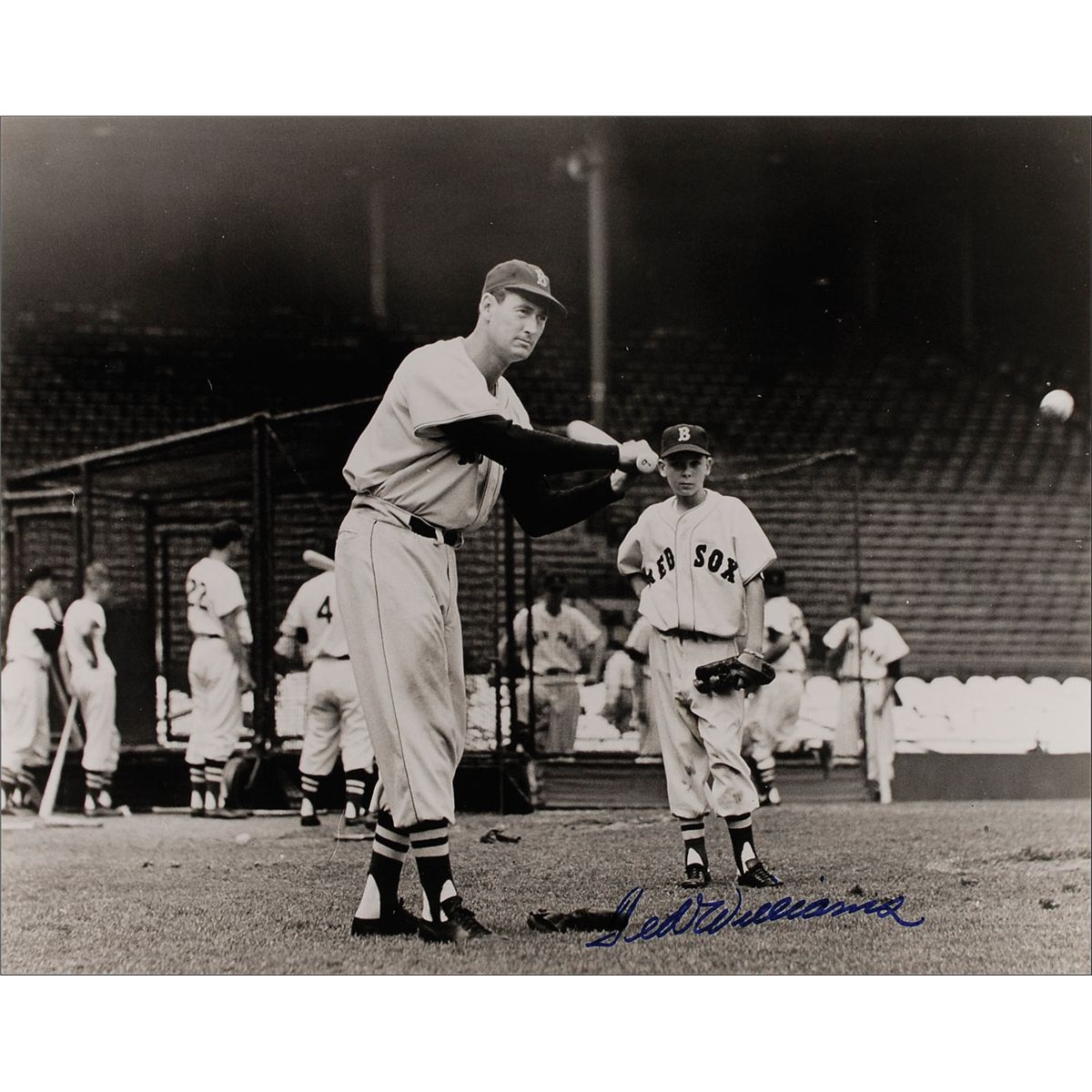 Excellent glossy 20 x 16 photo of Williams playing some pepper before a game at Fenway Park, signed in blue felt tip. In very fine condition.