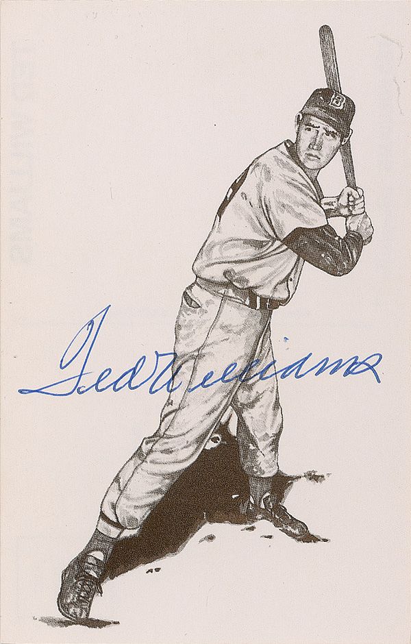 Postcard portrait of an artist’s rendition of Williams in his batting stance, 3.5 x 5.5, signed in blue ballpoint. In fine condition.