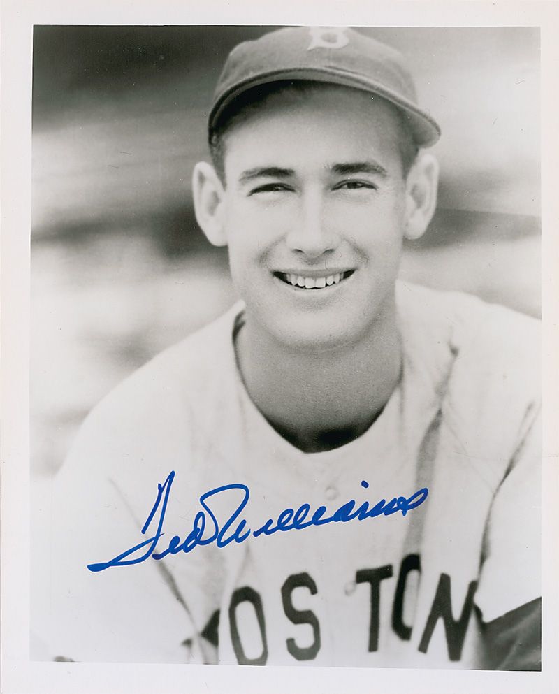 Glossy 8 x 10 photo of a young Ted Williams, signed in blue felt tip. In fine condition, with a light spot to the finish on the right edge.