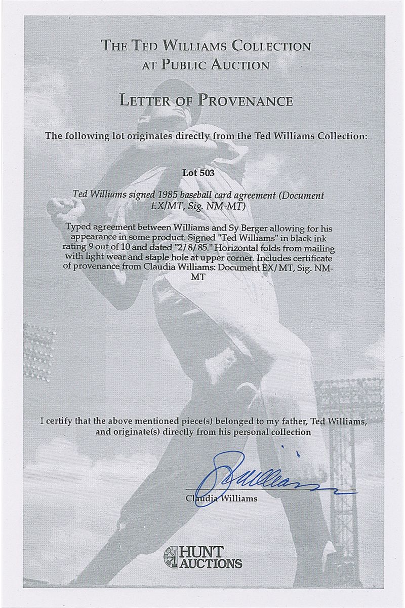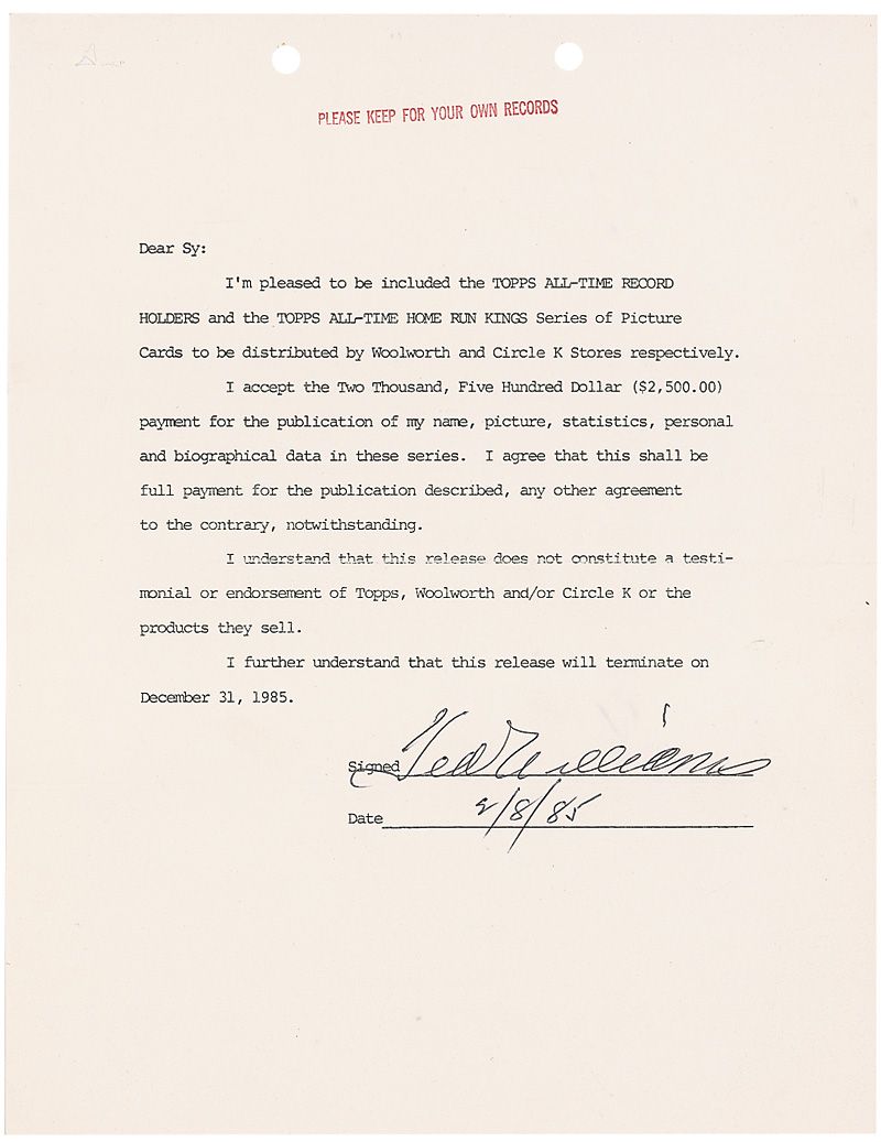 DS, one page, 8.5 x 11, February 8, 1985. Agreement with the Topps trading card company. In part: “I’m pleased to be included in the Topps All-Time Record Holders and the Topps All-Time Home Run Kings Series of Picture Cards to be distributed by Woolworth and Circle K stores respectively. I accept the Two Thousand, Five Hundred ($2,500.00) payment for the publication of my name, picture, statistics, personal and biographical data in these series.” Signed and dated at the conclusion by Williams. In fine condition, with two horizontal folds, a light crease to the lower right, and staple and filing holes to the top. Originates from the Williams family estate and is accompanied by a letter of provenance signed by his daughter.