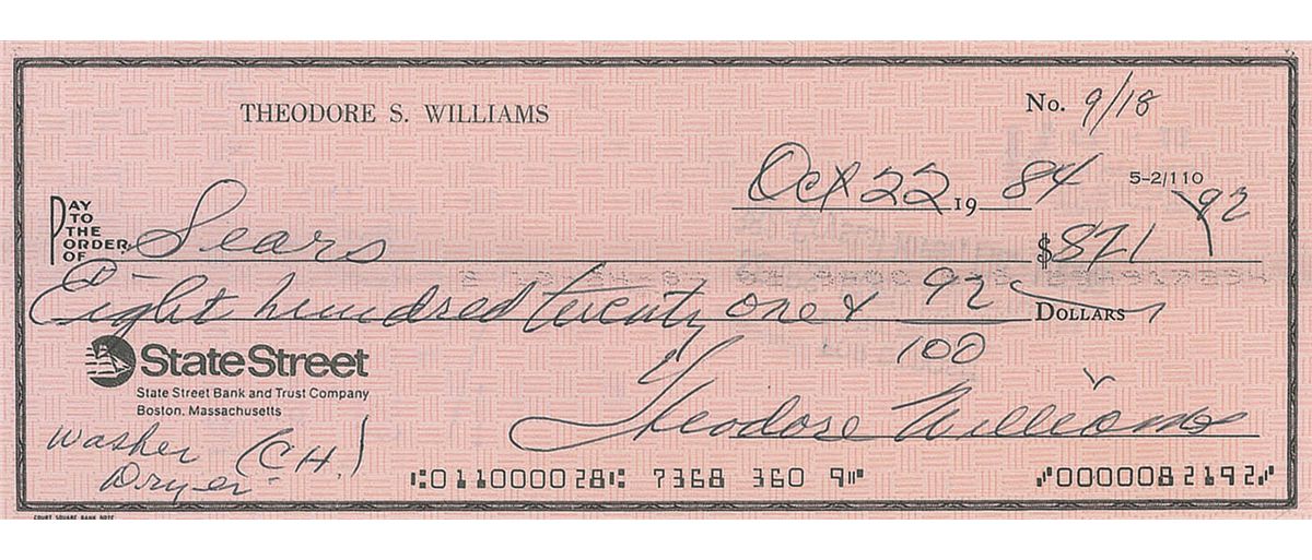 Personal check, 8.25 x 3, filled out and signed by Williams, “Theodore Williams,” payable to Sears for $821.92, October 22, 1984. In fine condition, with expected bank stamps. In the memo field, Williams notes that he is paying for a washer and dryer. Checks tend to exhibit at least some handling wear—checks in this fine condition are few and far between.