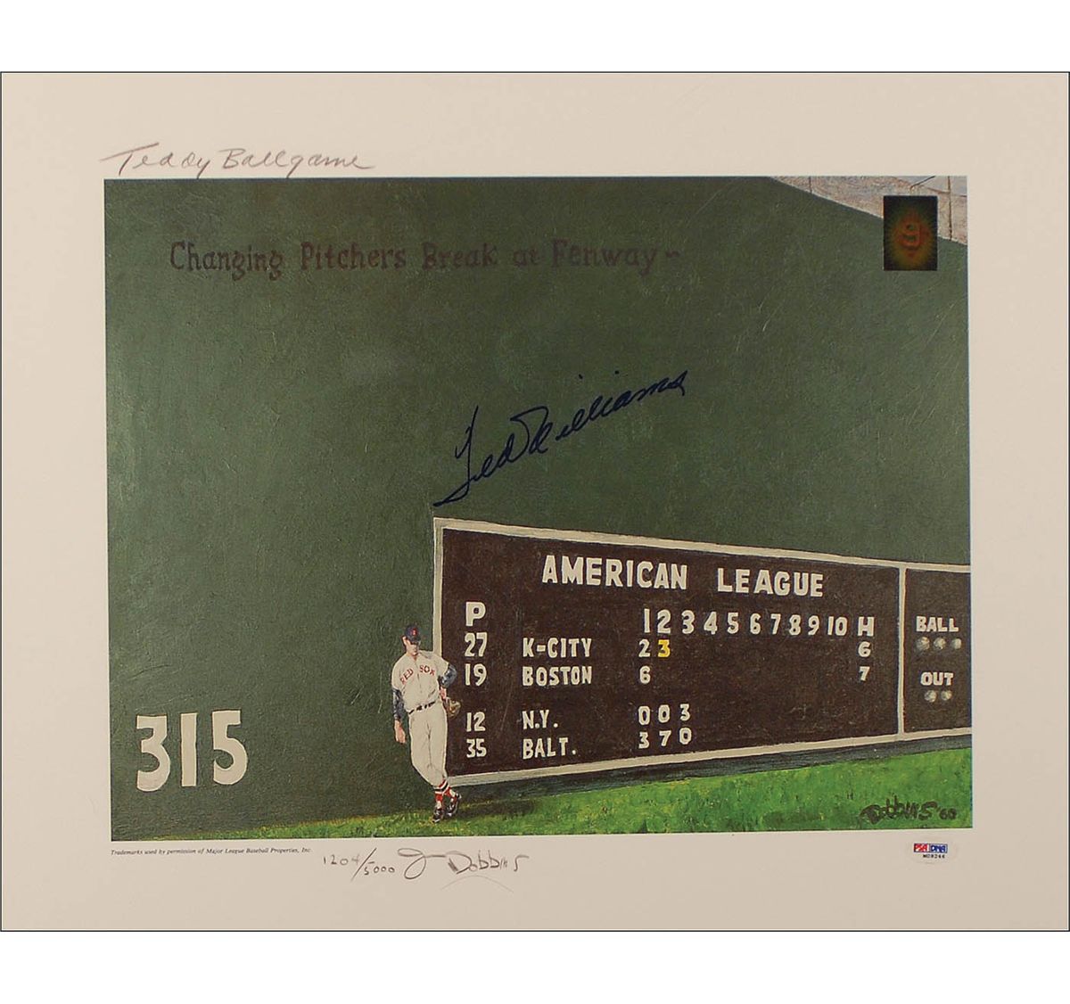 Color 20 x 16 print of Williams leaning against the Green Monster entitled ‘Teddy Ballgame,’ numbered #1204/5000, signed in black felt tip. Also signed in pencil by the artist, Jim Dobbins. Rolled and in fine condition, with a Green Diamond label affixed to the upper right and PSA/DNA label affixed to the lower right. Accompanied by a certificate of authenticity from Green Diamond and full letter of authenticity from PSA/DNA.