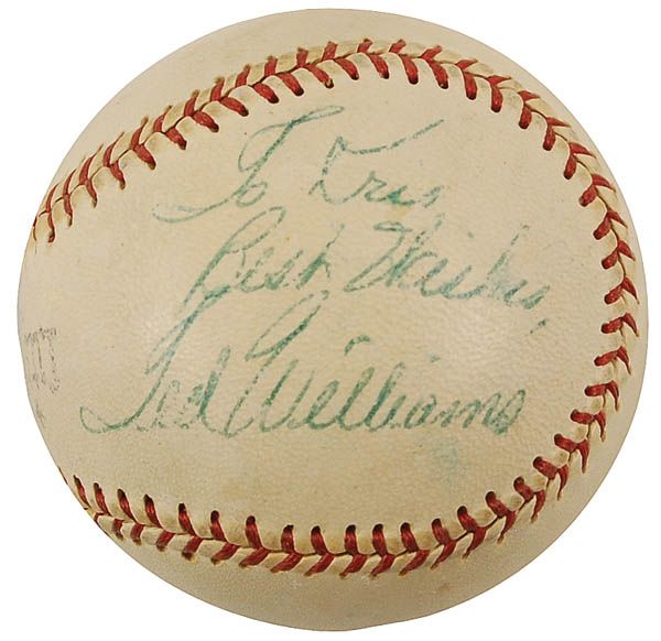 Vintage official Wilson Little League League baseball signed and inscribed in blue ballpoint on a side panel, “To Kris, Best wishes, Ted Williams.” In very good condition, with scattered toning, soiling, and dings, some lightly affecting the inscription and signature.
