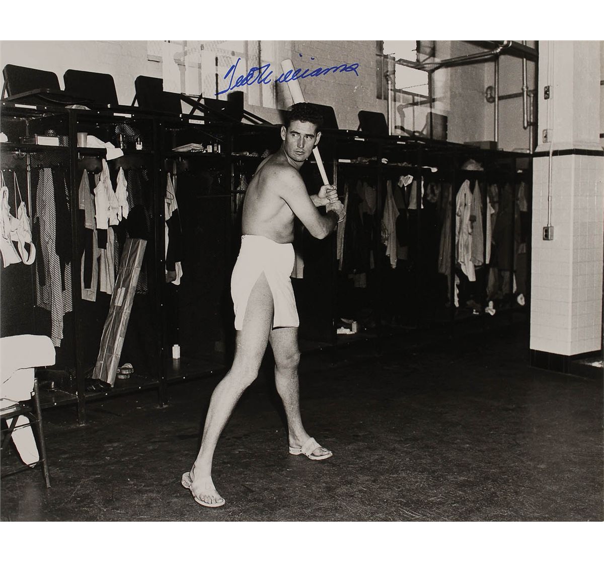 Unusual satin-finish 20 x 16 photo of Williams in his batting stance in the Red Sox locker room, clad in just a towel, signed in blue felt tip. In fine condition.