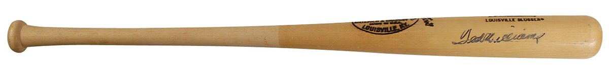Official Louisville Slugger Ted Williams model baseball bat signed in blue felt tip on the barrel above the trademark, and signed again in black felt tip. In fine condition, with some irregular ink adhesion and fingerprints to black felt tip signature. Th