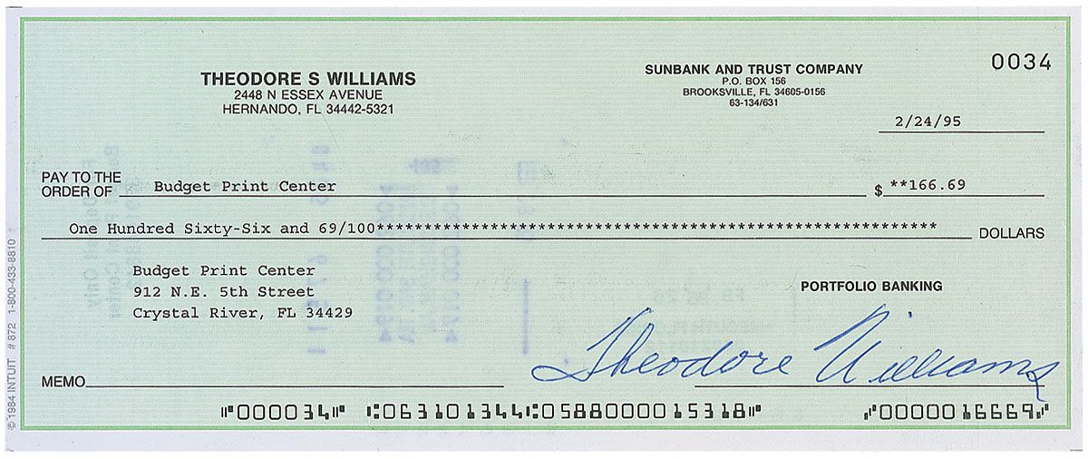 Personal check, 8.5 x 3.5, filled out in type and signed by Williams, “Theodore Williams,” payable to Budget Print Center for $166.69, February 24, 1995. In fine condition, with a mild central vertical fold and some show-through from bank stamps to revers